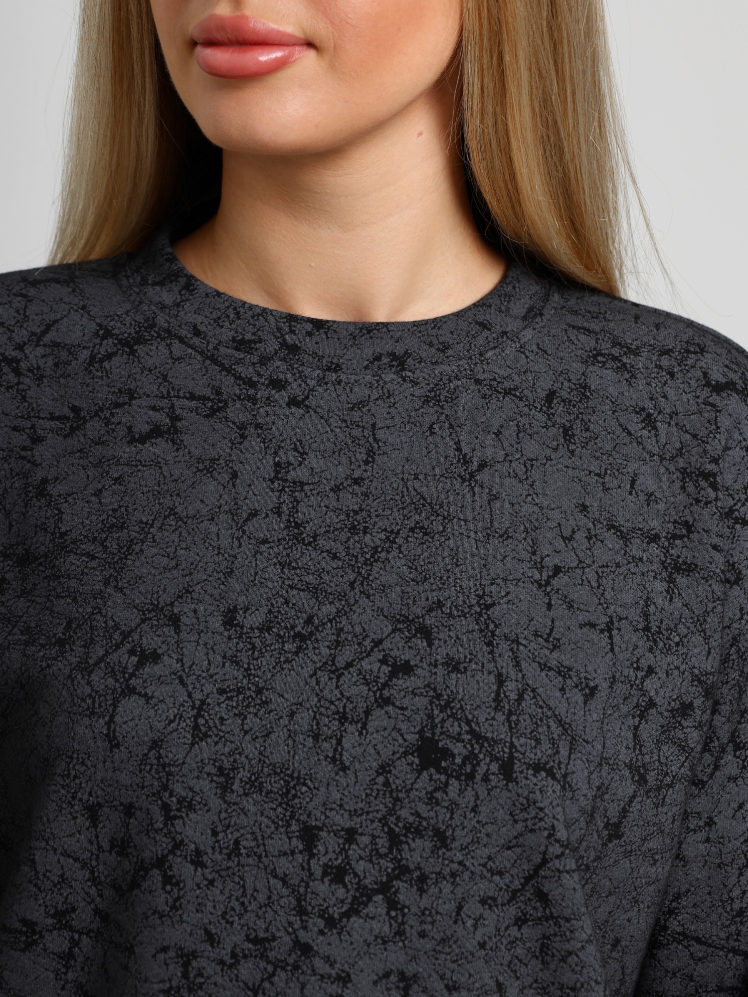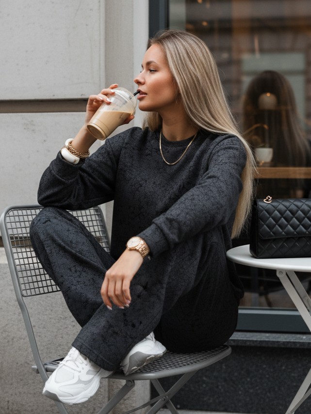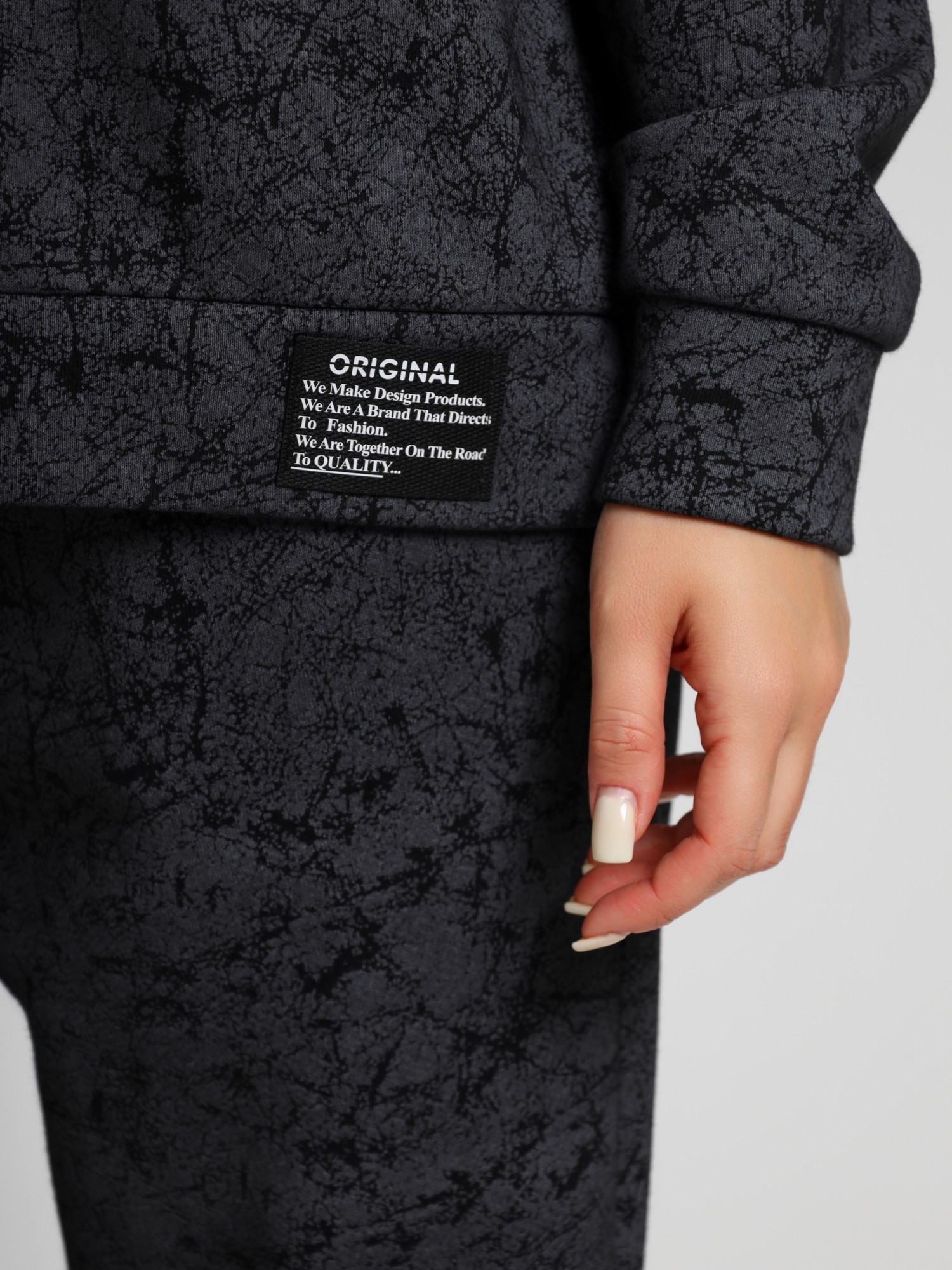 Костюм молодежный из трикотажного полотна футер трехнитка с «эффектом замши», состоящий из джемпера и брюк. Джемпер – прямого силуэта, с длинными втачными рукавами, горловиной овальной формы, обработанной втачной планкой. Рукава с манжетами, низ - с притачным поясом, дополненным декоративным элементом-нашивкой.Брюки – длинные, свободные, на притачном поясе с эластичной тесьмой внутри, карманами в боковых швах.