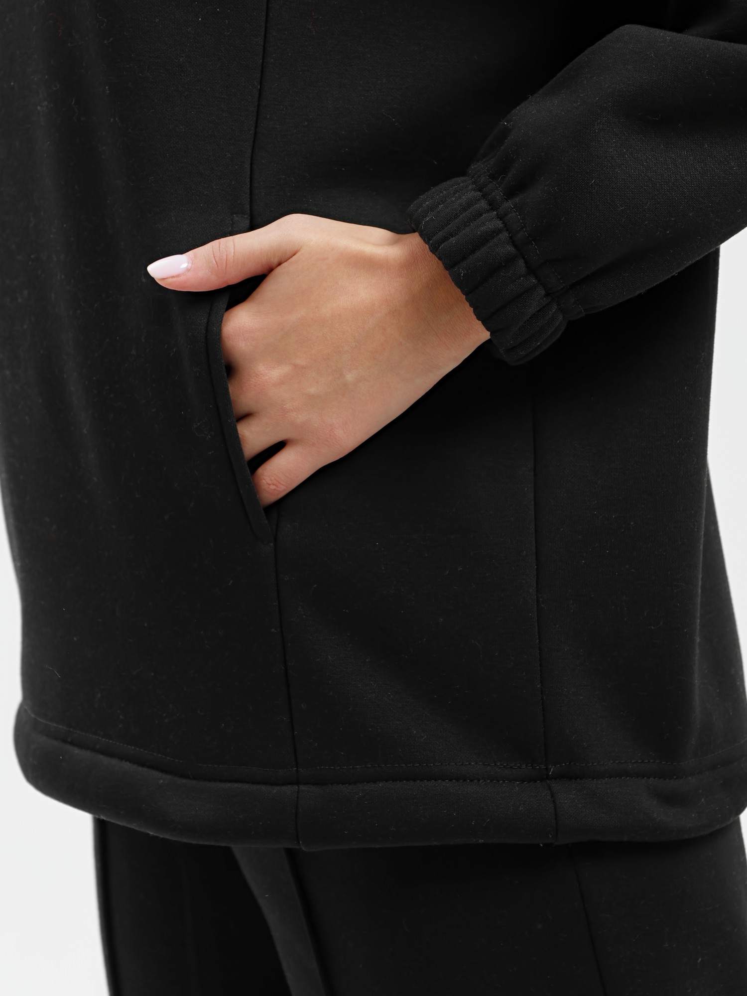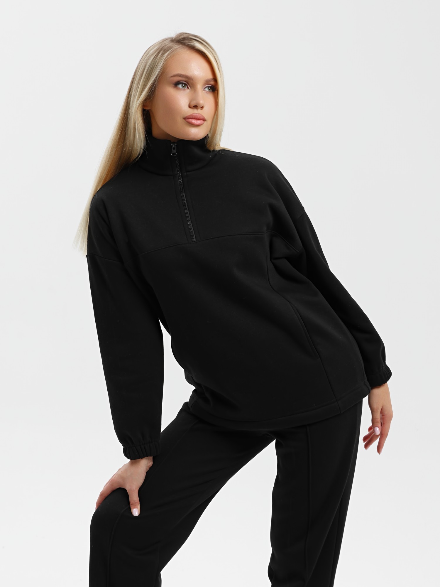 Костюм молодежный из трикотажного гладкокрашенного полотна «еврофлис», Джемпер - свободного покроя, с длинными втачными рукавами, нижние срезы которых обработаны эластичной тесьмой, воротником-стойкой и карманами в рельефных швах. Полочка - с отрезной кокеткой из двух частей, с застежкой "молния", обработанной в соединительном шве. Низ изделия с подгибкой и регулируется по ширине с помощью фиксатора.Брюки – длинные, полуприлегающего силуэта, на поясе с эластичной тесьмой внутри и карманами в боковых швах. Передние половины застрочены по центральным линиям.