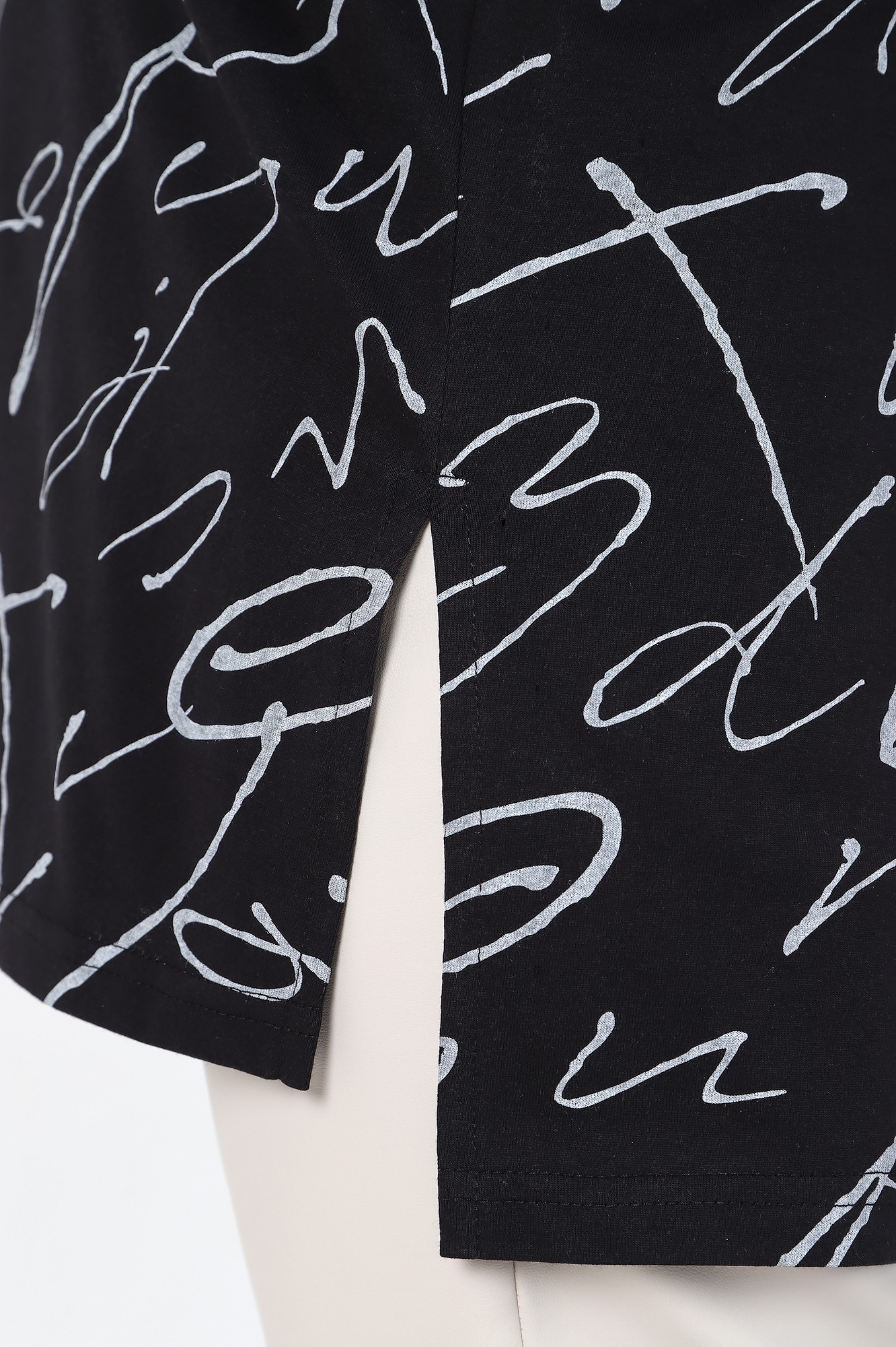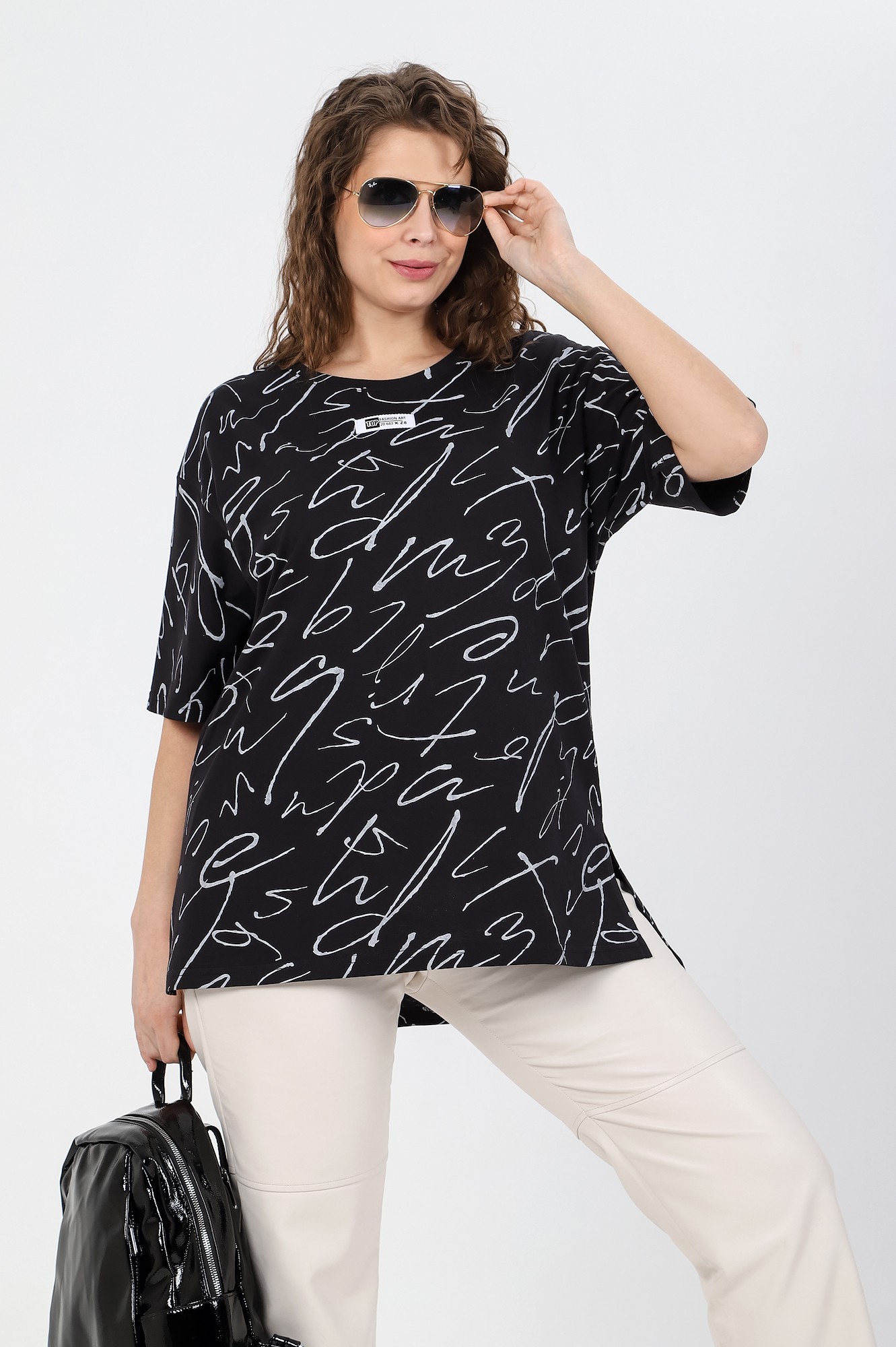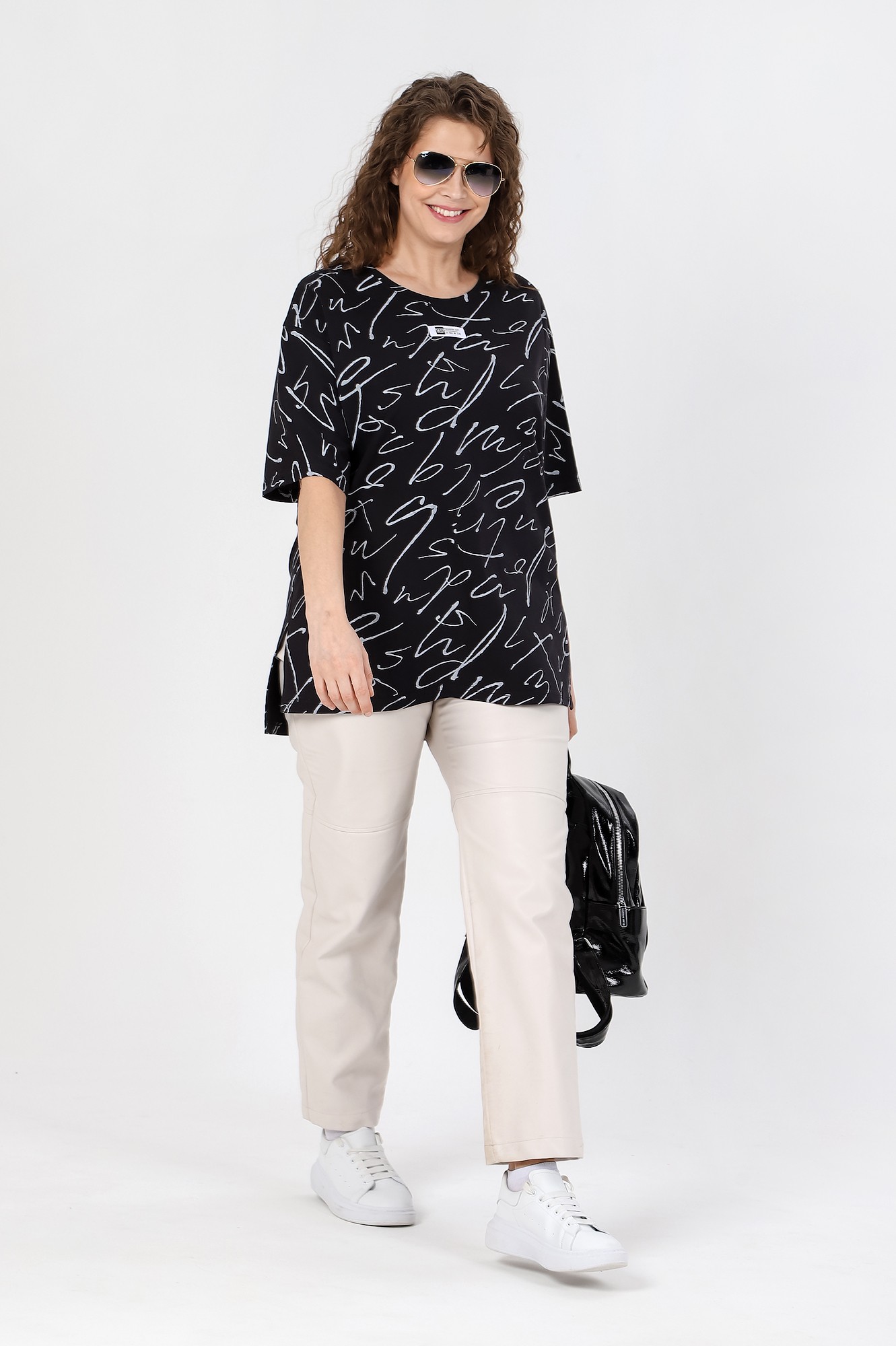 Футболка женская из трикотажного полотна «кулирка» с набивным рисунком, свободного покроя, со спущенным плечом и втачными рукавами длиной до локтя, горловиной овальной формы, обработанной втачной планкой, по центру полочки настрочен декоративный элемент, в нижней части боковых швов – разрезы.