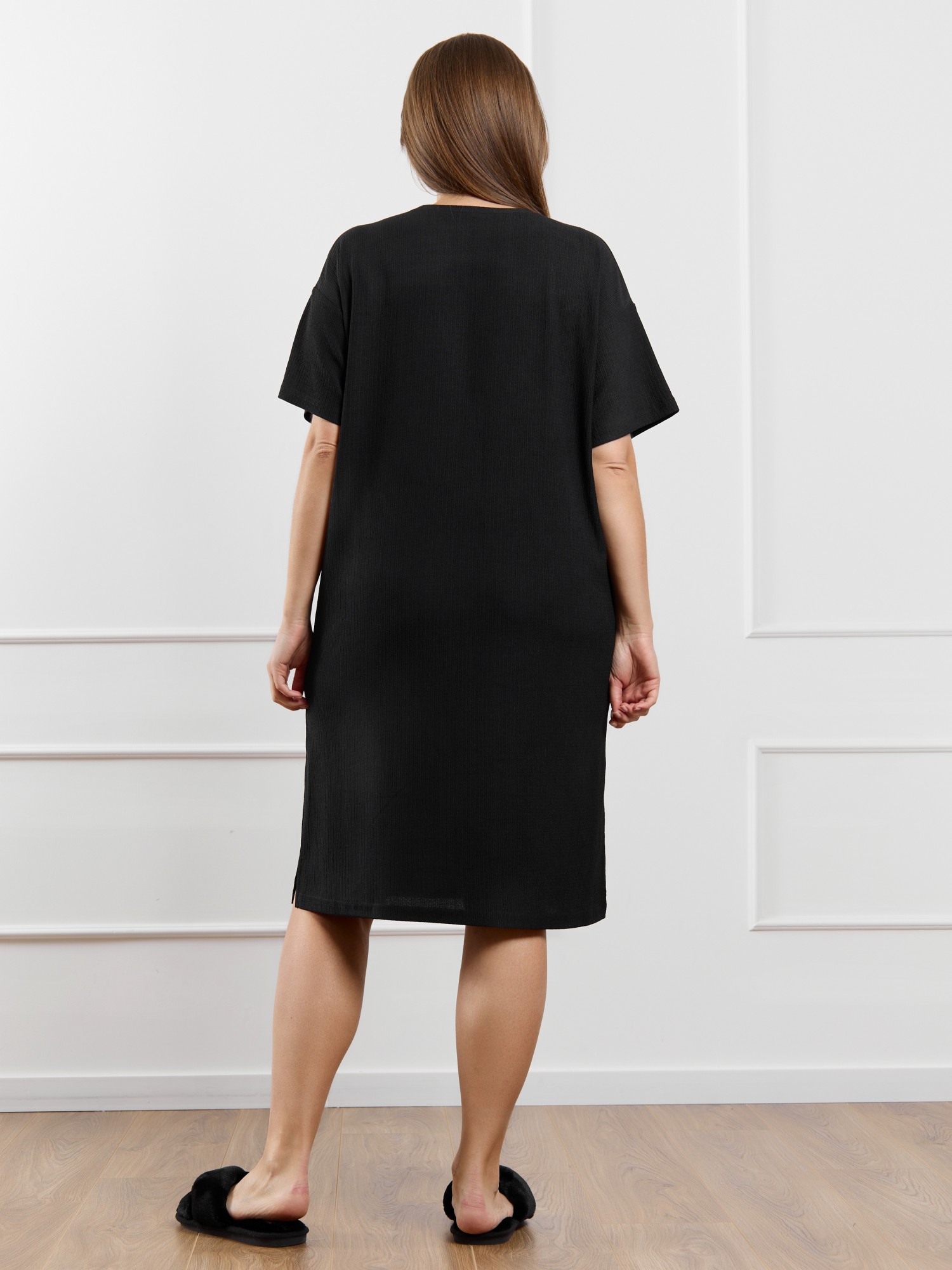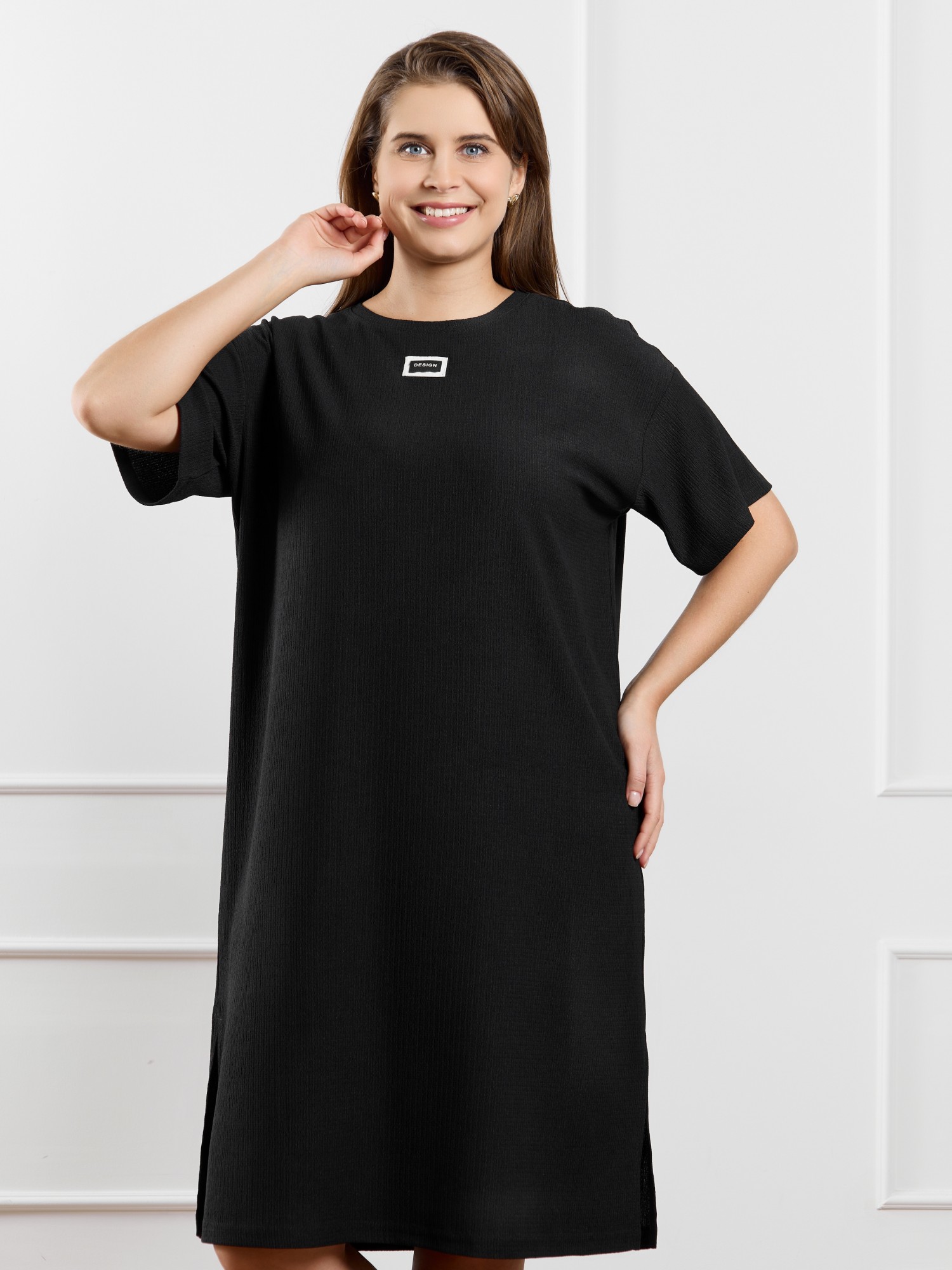 Туника женская из гладкокрашенного трикотажного полотна «бурумчук», прямого силуэта, с короткими втачными рукавами, горловиной овальной формы, обработанной втачной планкой, с разрезами в боковых швах. По центру полочки ниже горловины - настрочен декоративный элемент-нашивка.