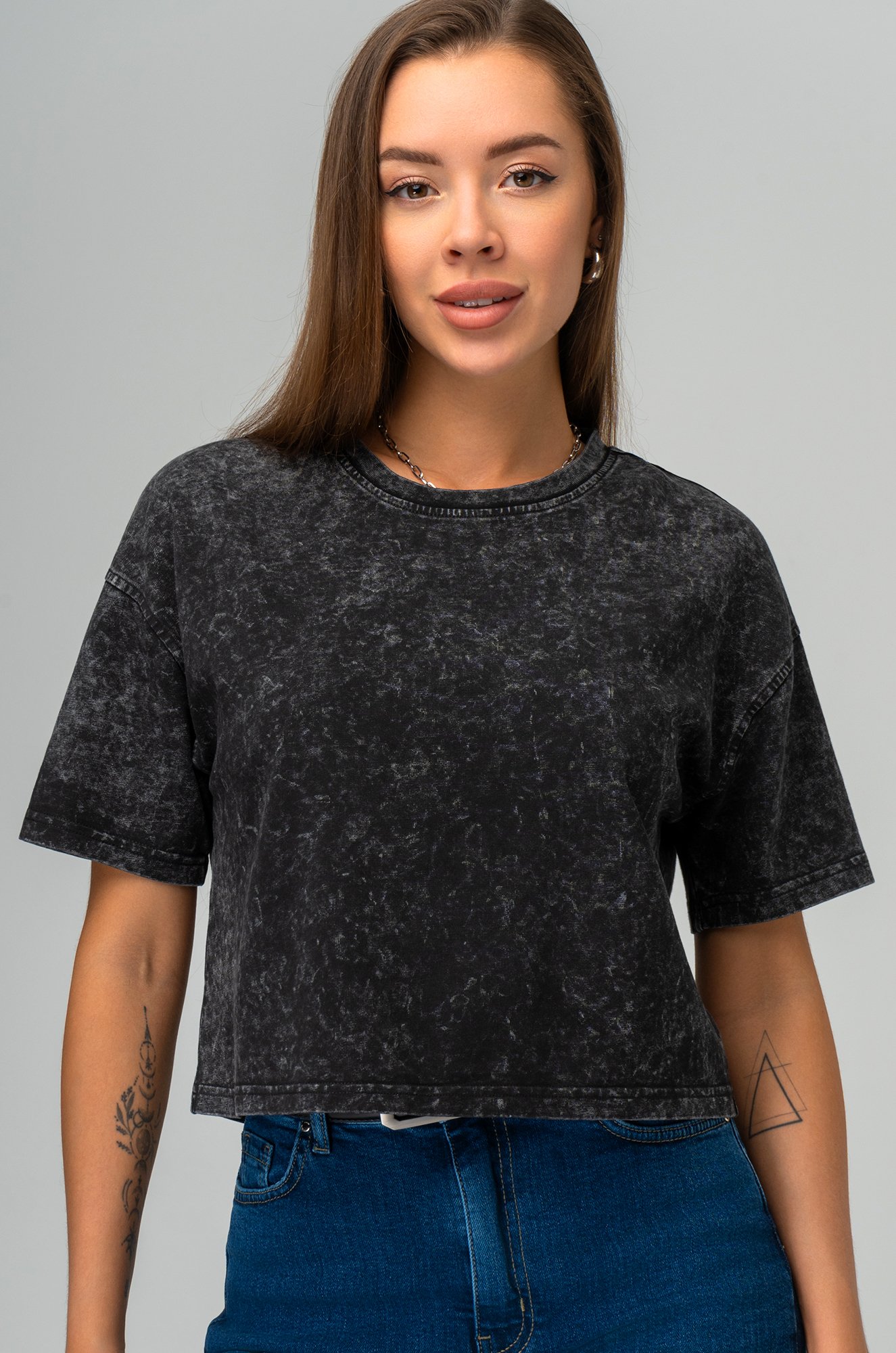 Укороченная женская футболка черного цвета – идеальный вариант в кэжуал стиле. Круглый вырез горловины, короткий рукав и силуэт оверсайз окунут в мир свободы и комфорта и сделают футболку для женщин и девушек максимально удобной!