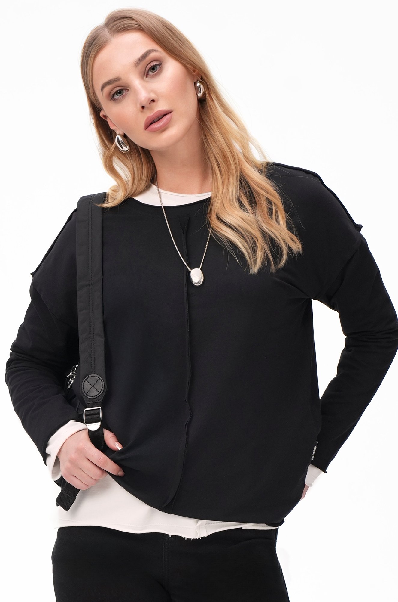 Комфорт с характером — черный женский ..показатьлонгслив в стиле оверсайз создаёт расслабленное настроение и стильно завершает повседневный образ. Свободный хлопковый лонг идеален для лета, прохладных осенних вечеров и в демисезон.