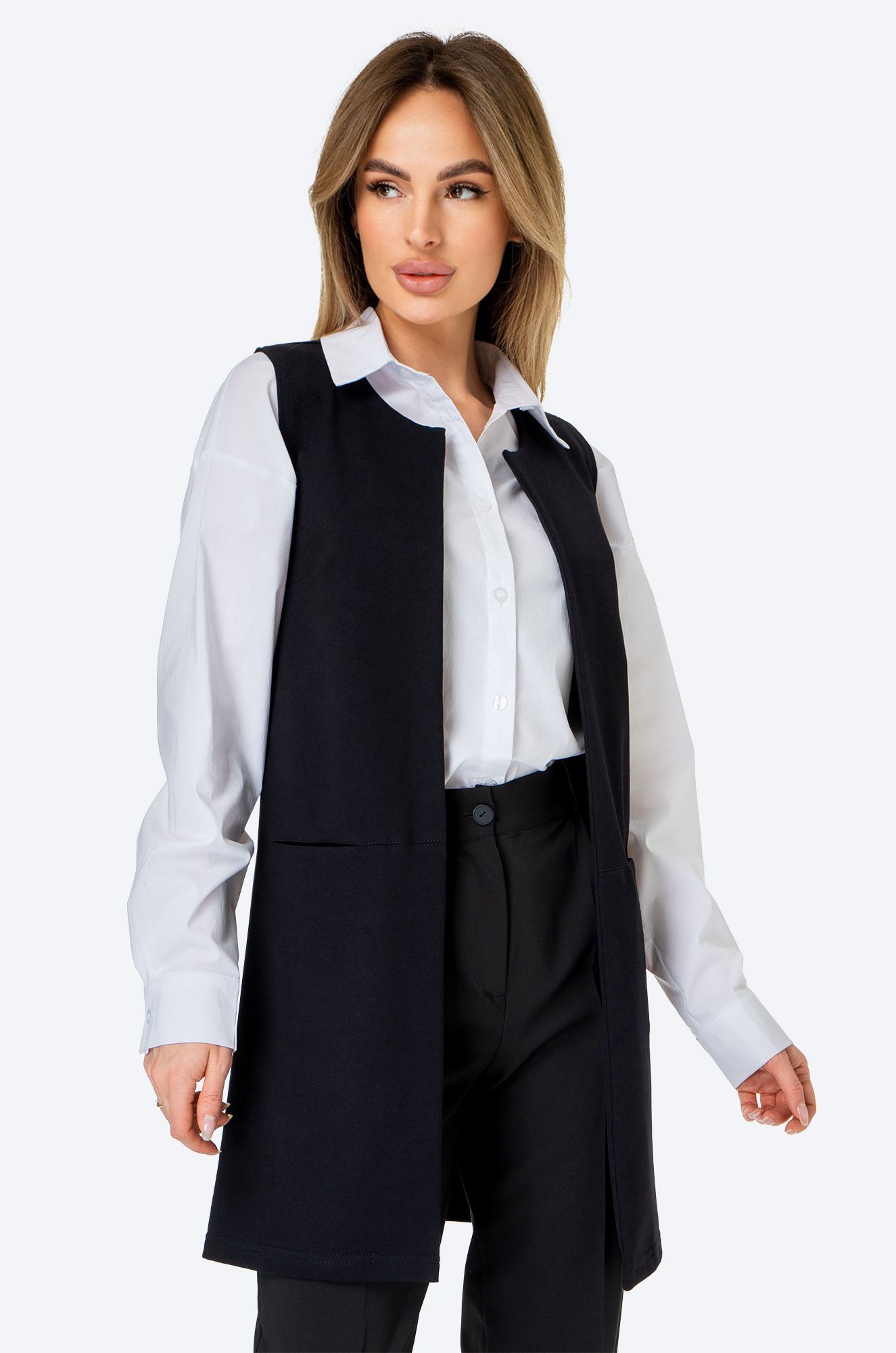 Прямой крой позволяет составлять с офисным жилетом многослойные демисезонные образы. По бокам имеются врезные карманы. Однотонная модель из хлопка отлично подойдет женщинам и девушкам.