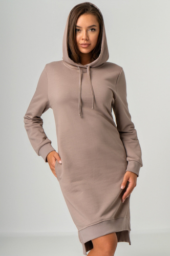 Спортивное женское платье с капюшоном — идеальный выбор для тех, кто ценит комфорт. Удобный капюшон на шнурке защищает от ветра и добавляет уют. Для удобства по бокам предусмотрены карманы.