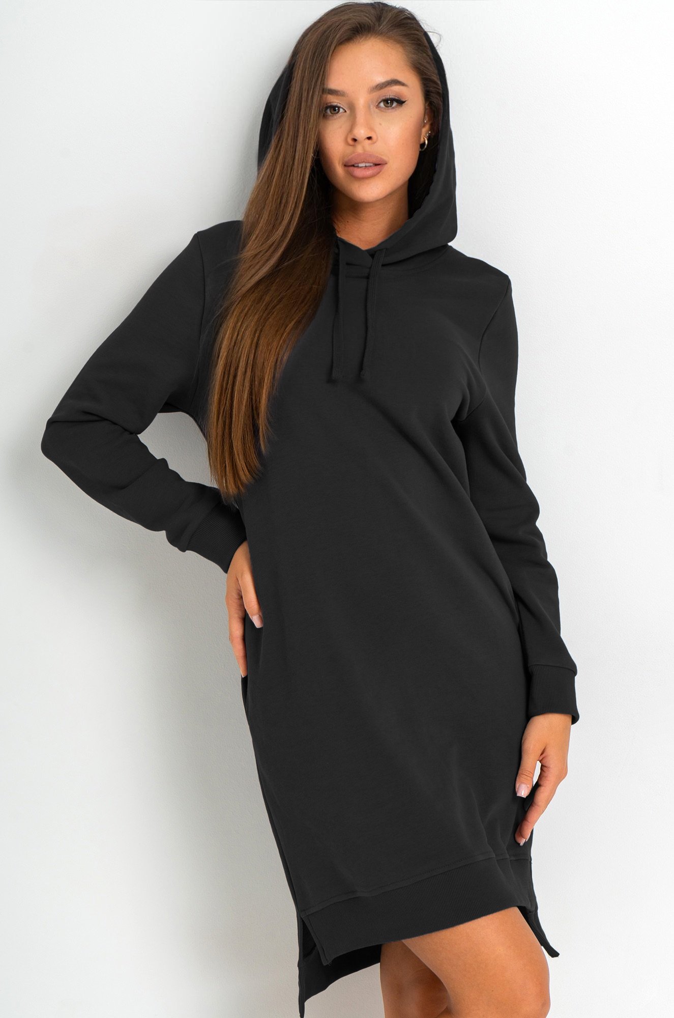 Черное платье-худи выполнено из футера трехнитки — натуральный хлопок в составе дарит мягкость и комфорт, а добавление полиэстера сохраняет форму и делает трикотажное платье устойчивым к износу.