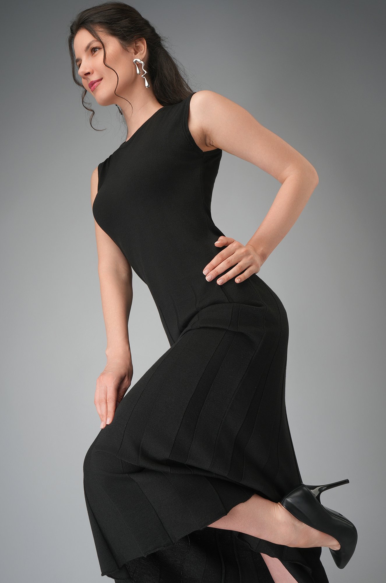 Длинное вязаное платье миди черного цвета станет основой гардероба для женщин, ценящих безупречный стиль и утончённую эстетику. Его силуэт, мягко облегающий верх и расклешённый к низу за счёт изящных складок, создаёт элегантный образ. Женское платье струится при движении, придавая ощущение лёгкости и особого шарма.