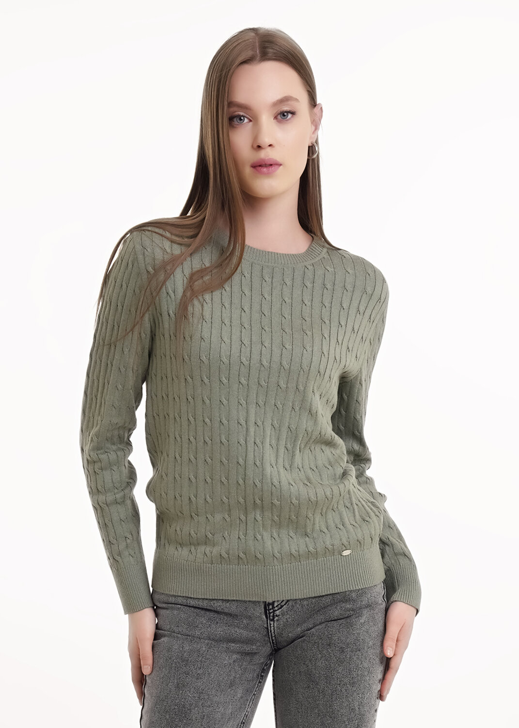 Вязаный джемпер прямого силуэта из хлопковой пряжи с добавлением акрила, переплетение "косы". Втачной длинный рукав. Округлая горловина с бейкой. По низу изделия и рукавов манжеты.