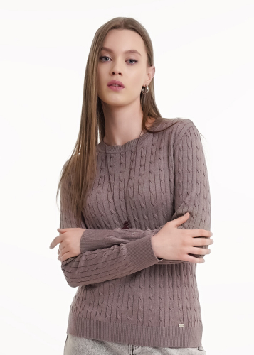 Вязаный джемпер прямого силуэта из хлопковой пряжи с добавлением акрила, переплетение "косы". Втачной длинный рукав. Округлая горловина с бейкой. По низу изделия и рукавов манжеты.