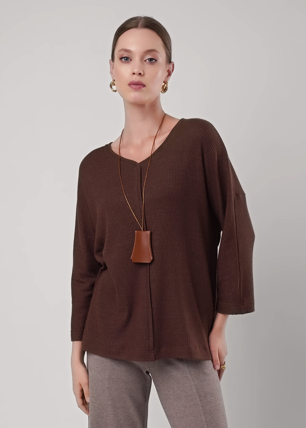 Джемпер свободного кроя из трикотажного полотна кашкорсе. По горловине притачная обтачка, переходящая на перед. Длинный цельнокроенный рукав спереди, по спинке спущенный. По переду и спинке средний шов.