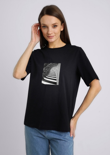Джемпер оверсайз из хлопкового трикотажного полотна. Короткий втачной рукав. Круглый вырез горловины обработан рибаной. По бокам разрезы. По переду термонаклейка.