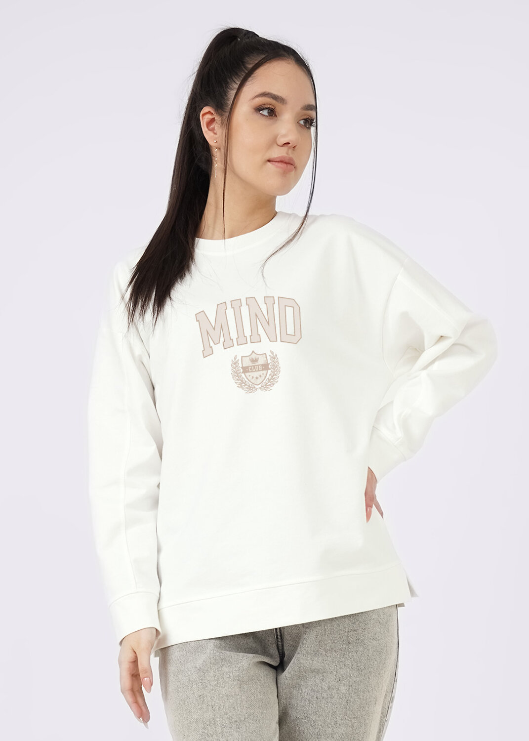Толстовка из футера 2-х нитки умеренного объема со спущенной линией плеча,спереди по рукавам декоративные резы. Округлая горловина с обтачкой из кашкорсе.По низу рукава и изделия притачные манжеты. Завершает дизайн на детали переда принт.