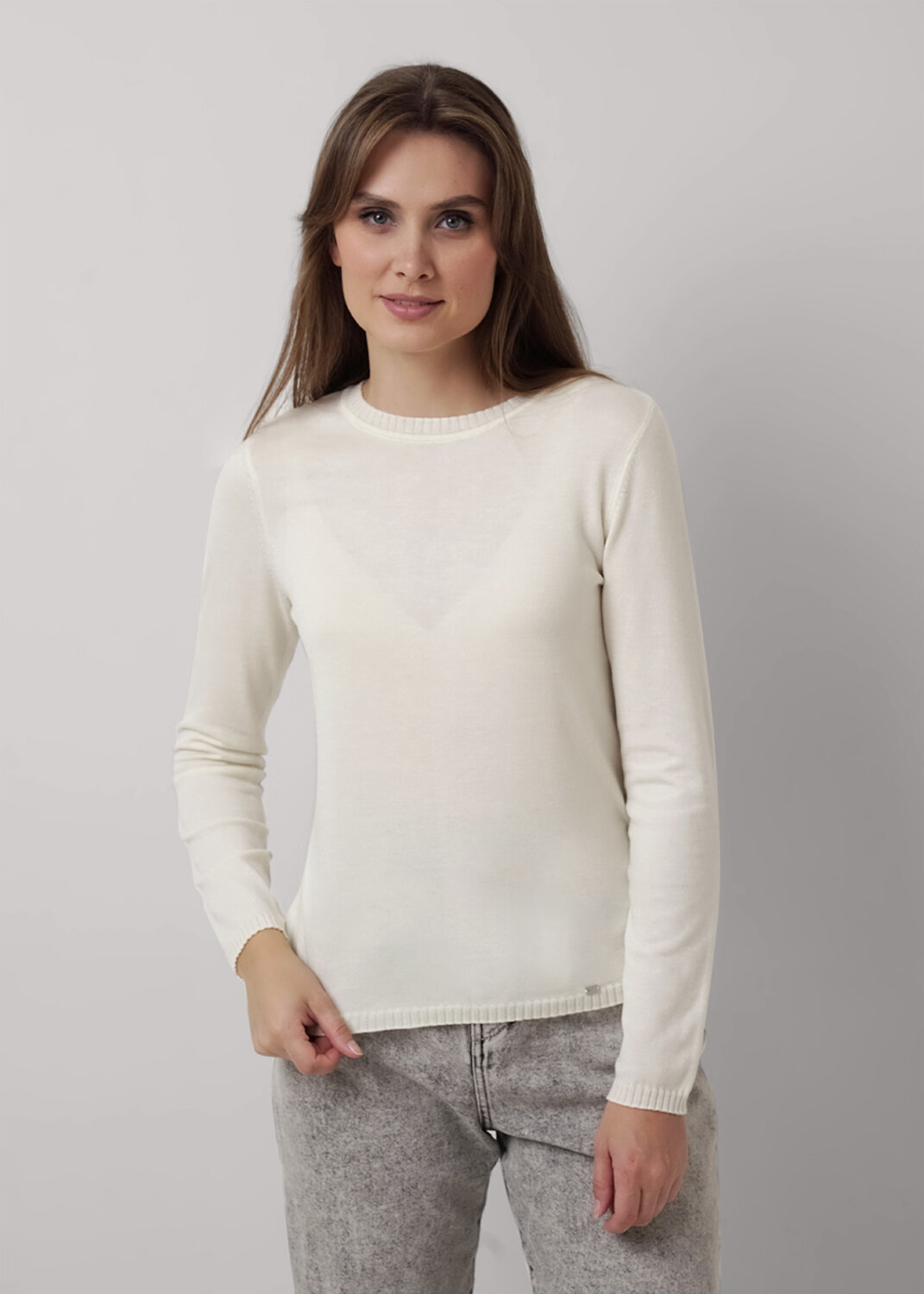 Вязаный джемпер прямого силуэта из вискозной пряжи с добавлением нейлона. Длинный втачной рукав. Основное переплетение гладь. Округлая горловина с бейкой. По низу изделия и рукавов узкие манжеты, нашивка металл.