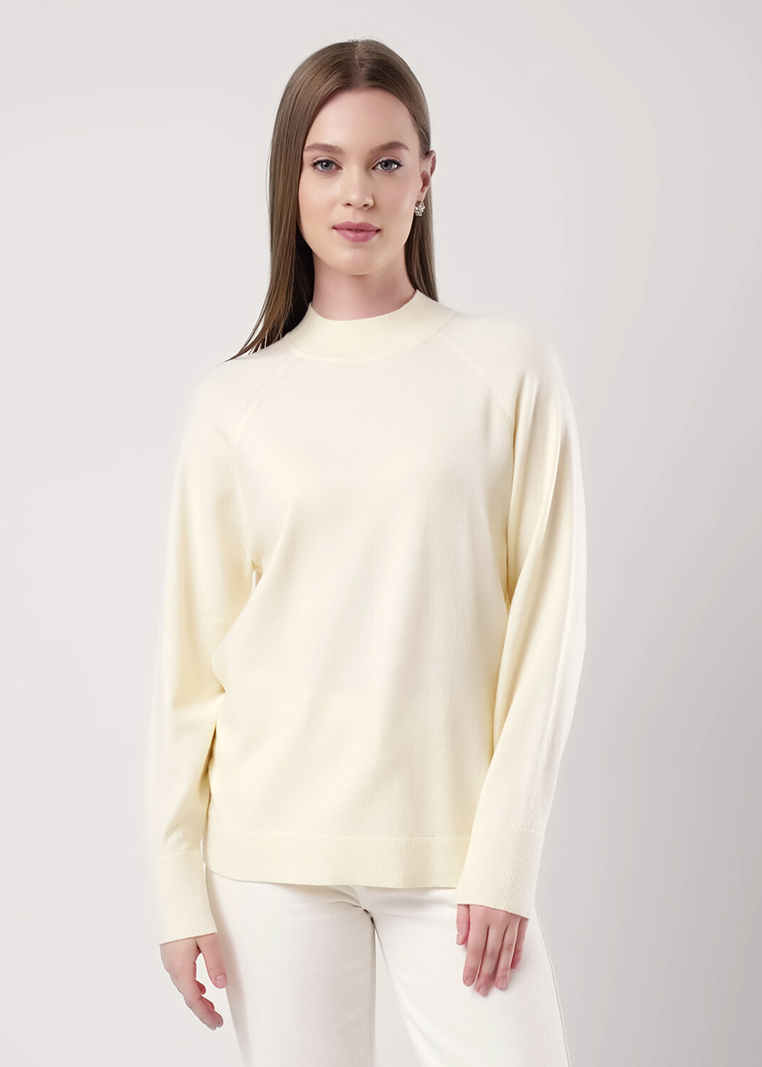 Вязаный джемпер свободного силуэта из вискозной пряжи, переплетения гладь. Длинный рукав реглан. Округлая горловина стойка без загиба. По низу изделия и рукавов манжеты. Спереди нашивка металл.