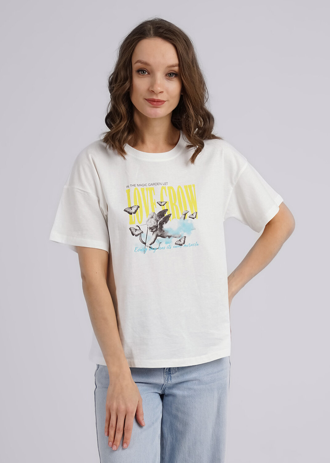 Футболка прямого силуэта свободного прилегания с втачным рукавом, горловина обработана обтачкой