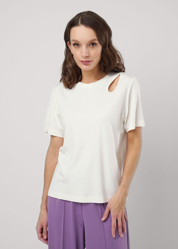 Футболка прямого силуэта из трикотажного полотна интерлок. Короткий втачной рукав. Округлая горловина с обтачкой. По левой линии плеча фигурный вырез с окантовкой.