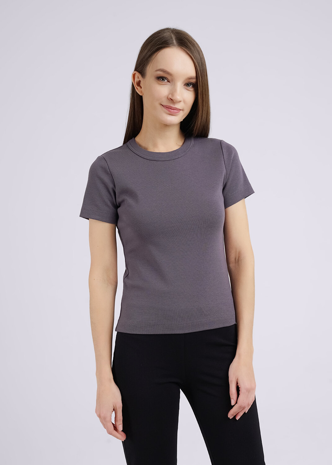 Футболка женская из эластичного хлопкового полотна - рибана. Приталенный крой. Круглый вырез горловины. Короткий рукав.