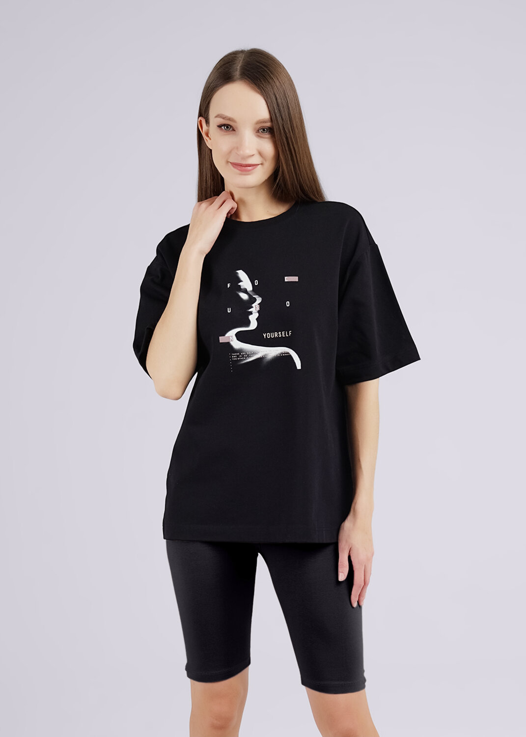 Футболка прямого силуэта из плотного трикотажного полотна. Со спущенным рукавом длиной до локтя. Круглый вырез горловины.
