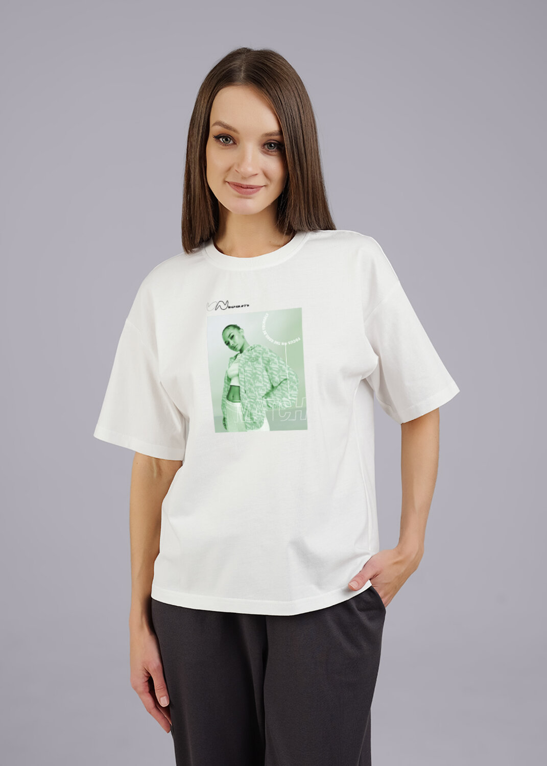 Джемпер для дома и отдыха из трикотажного полотна, свободного кроя. Короткий рукав со спущенной линией плеча. Округлая горловина с обтачкой из кашкорсе. По спинке шов. На детали переда принт и термонаклейка.