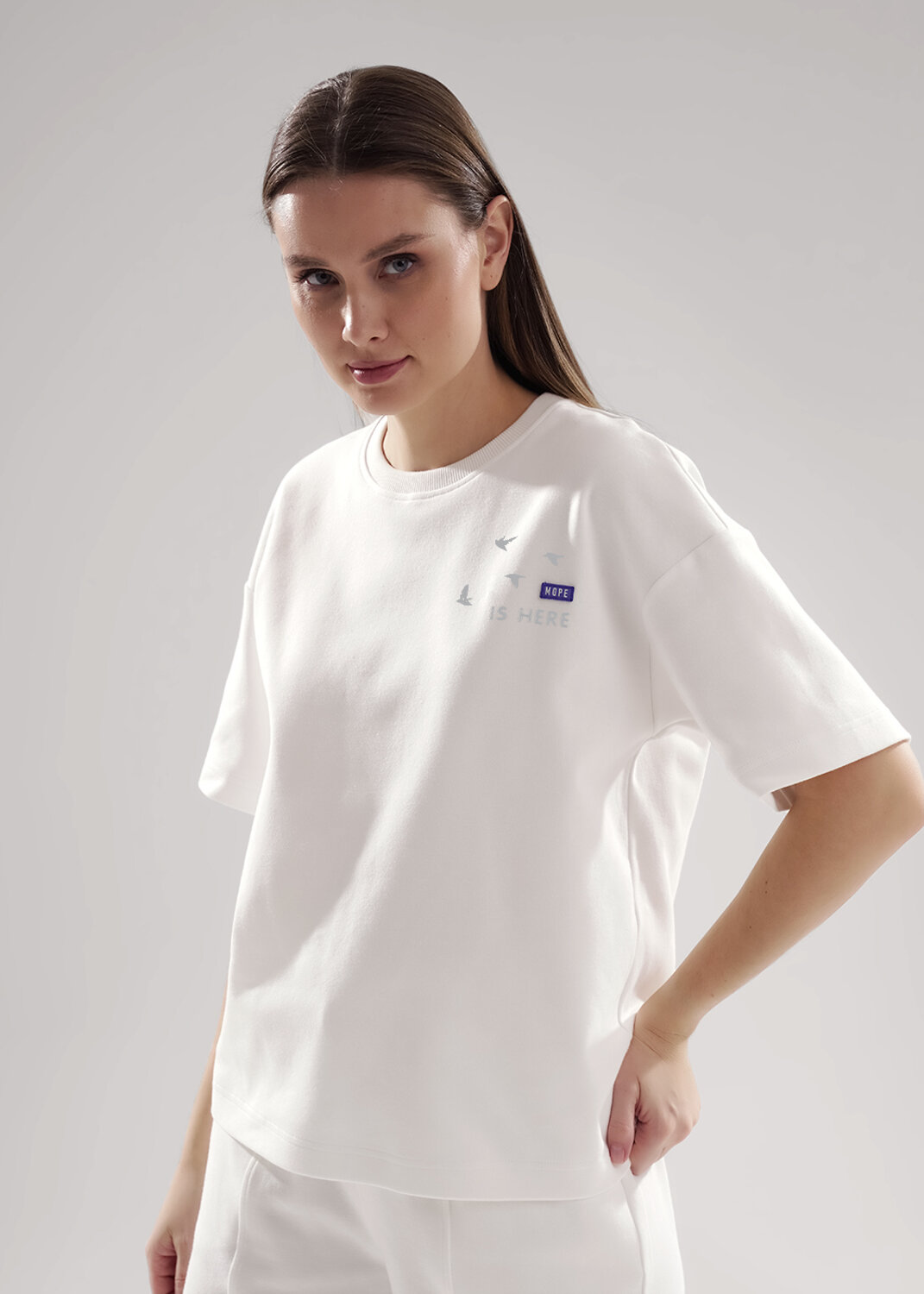 Футболка для дома и отдыха прямого силуэта из хлопкового трикотажного полотна интерлок. Округлая горловина с обтачкой из кашкорсе. Короткий рукав со спущенной линией плеча. На детали переда принт, нашивка.