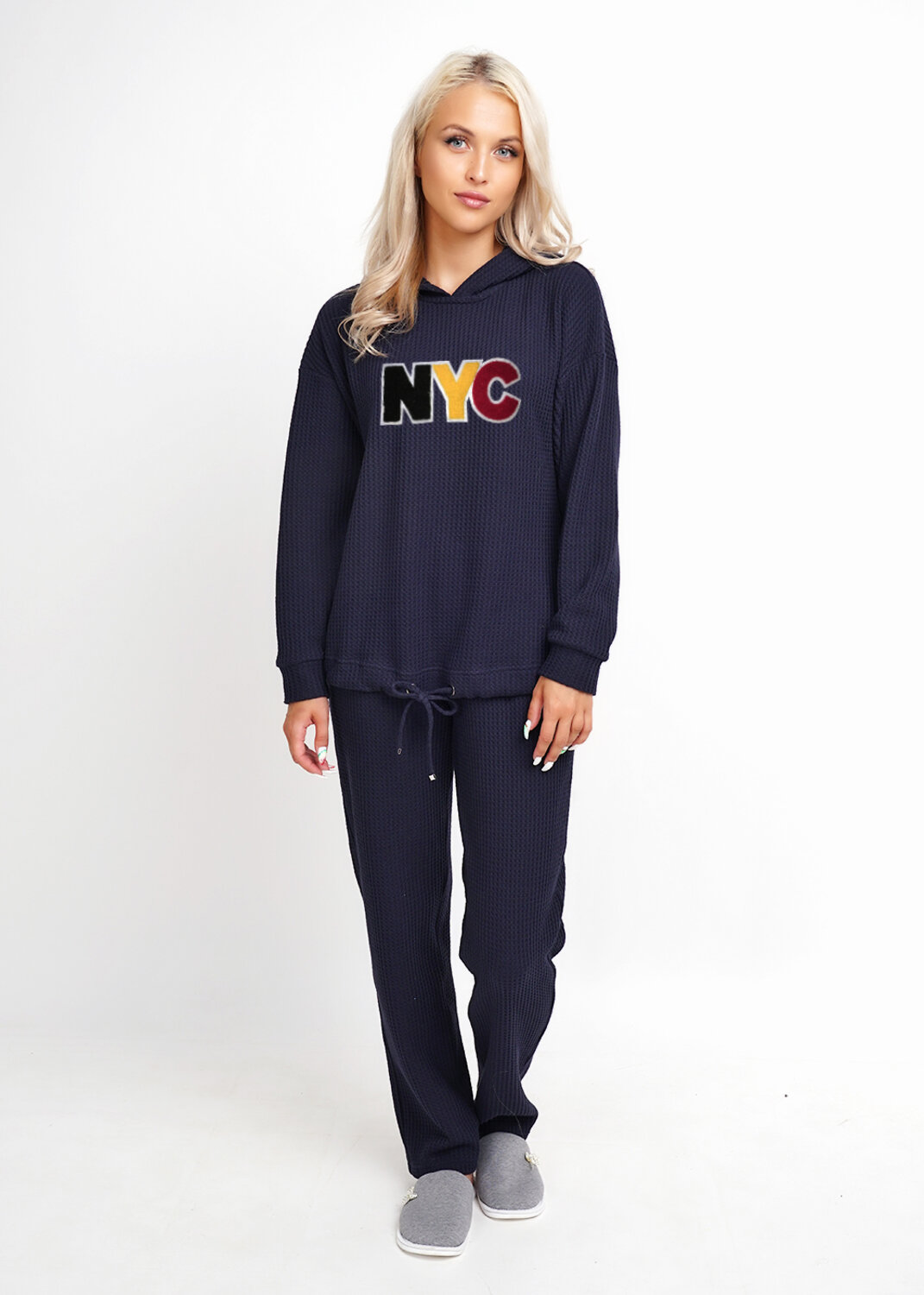 Комплект из фактурного полотна "вафли" с начёсом. Джемпер с капюшоном, длинным рукавом на манжете и кулисой понизу. Спереди объёмная нашивка. NYC- New York. Брюки прямые с карманами.