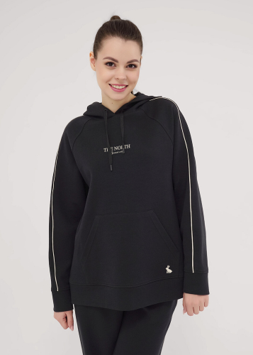 Куртка спортивная из трикотажного полотна,на молнии.По горловине капюшон со шнуром,Спущенная линия плеча,длинный рукав,внизу принт.По низу рукава,изделия манжет из кашкорсе.По переду и рукаву отстроченные резы,карманы в шве.На полочке гофропринт,нашивка