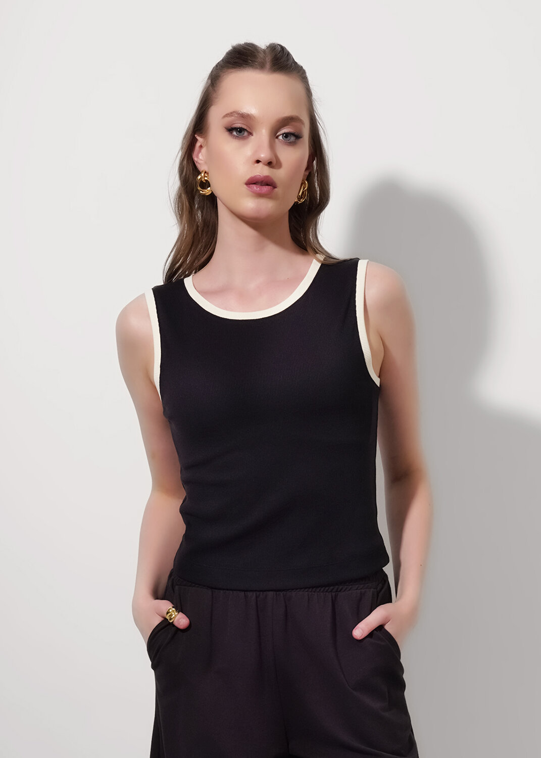 Майка из трикотажного полотна кашкорсе. Средняя ширина плеча. Округлая горловина. По горловине и пройме контрастная обтачка.