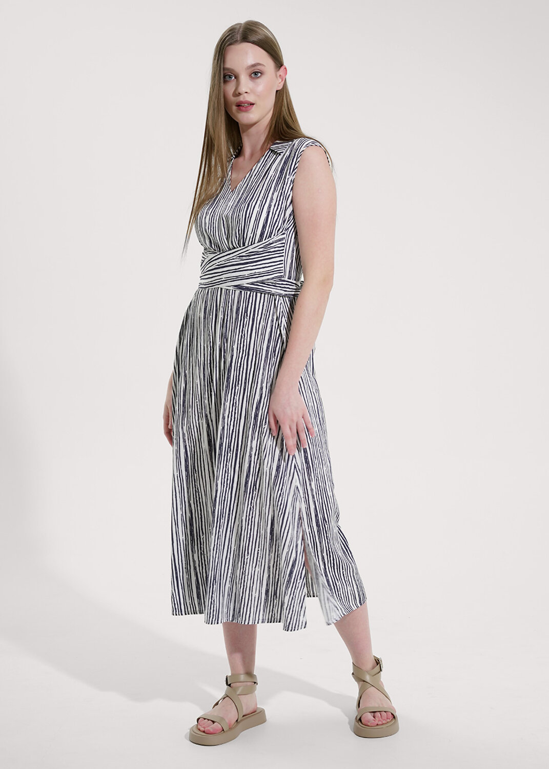Платье из текстильного полотна штапель, длиной миди, без рукавов. V-образный вырез горловины с отложным воротником и обтачками по горловине и пройме. Спереди шов, по бокам широкие обтачные завязки. Внизу изделия по бокам разрезы.