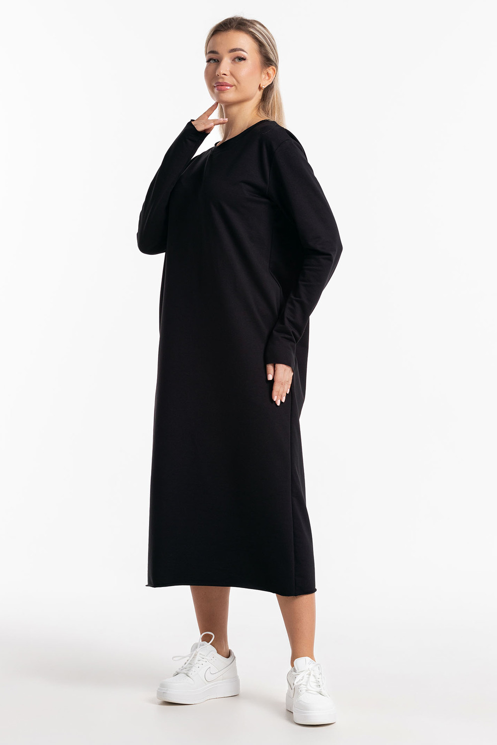 Платье повседневное трикотажное оверсайз. Женское платье, которое сочетает в себе комфорт, стиль и уникальность. Платье женское осень. Идеальный выбор для создания стильного и уютного образа.Это платье изготовлено из плотной, высококачественной и дышащей хлопковой ткани- футер 2-х нитка, что обеспечивает приятное ощущение на коже и комфорт в течение всего дня. Платье выполнено в прямом крое и имеет макси длину, что придает ему элегантность и утонченность. Трендовый вид товару придает округлый вырез горловины и длинные рукава. Необработанные края придают изделию особый стиль и эстетическую привлекательность. Необработанный край такой же прочный и стойкий к стирке и износу, как обработанный и отстроченный край. Не подвержен разрушению и сохраняет свою структуру и форму даже после многочисленных стирок. Платье позволяет подчеркнуть женственные формы и при этом не сковывает движения. Благодаря свободному крою, платье подходит для различных фигур и создает элегантный силуэт. Отлично держит форму при носке, не скатывается и обладает высокой износостойкостью. Материал не колется, очень приятный и мягкий к телу. Благодаря своему крою платье прекрасно скрывает любые несовершенства фигуры для полных дам, беременных и кормящих. Платье идеально подойдет для повседневной носки, в ней будет удобно в офисе или на учебе, комфортно на прогулке, в путешествии или на свидании. Идеально подойдет для фотосессий. Благодаря своему удобству и стилю, оно станет вашим незаменимым спутником в любое время года. Независимо от того, где вы носите это платье - на работе, на вечеринке или дома, оно будет подчеркивать вашу индивидуальность и придавать вам уверенности. Благодаря своей универсальности, оно прекрасно подходит как для высоких, так и для более низких женщин. Цвет: черный;голубой; Материал: футер 2-х нитка; Состав: хлопок-70%, пэ-24%, лайкра-6%.
