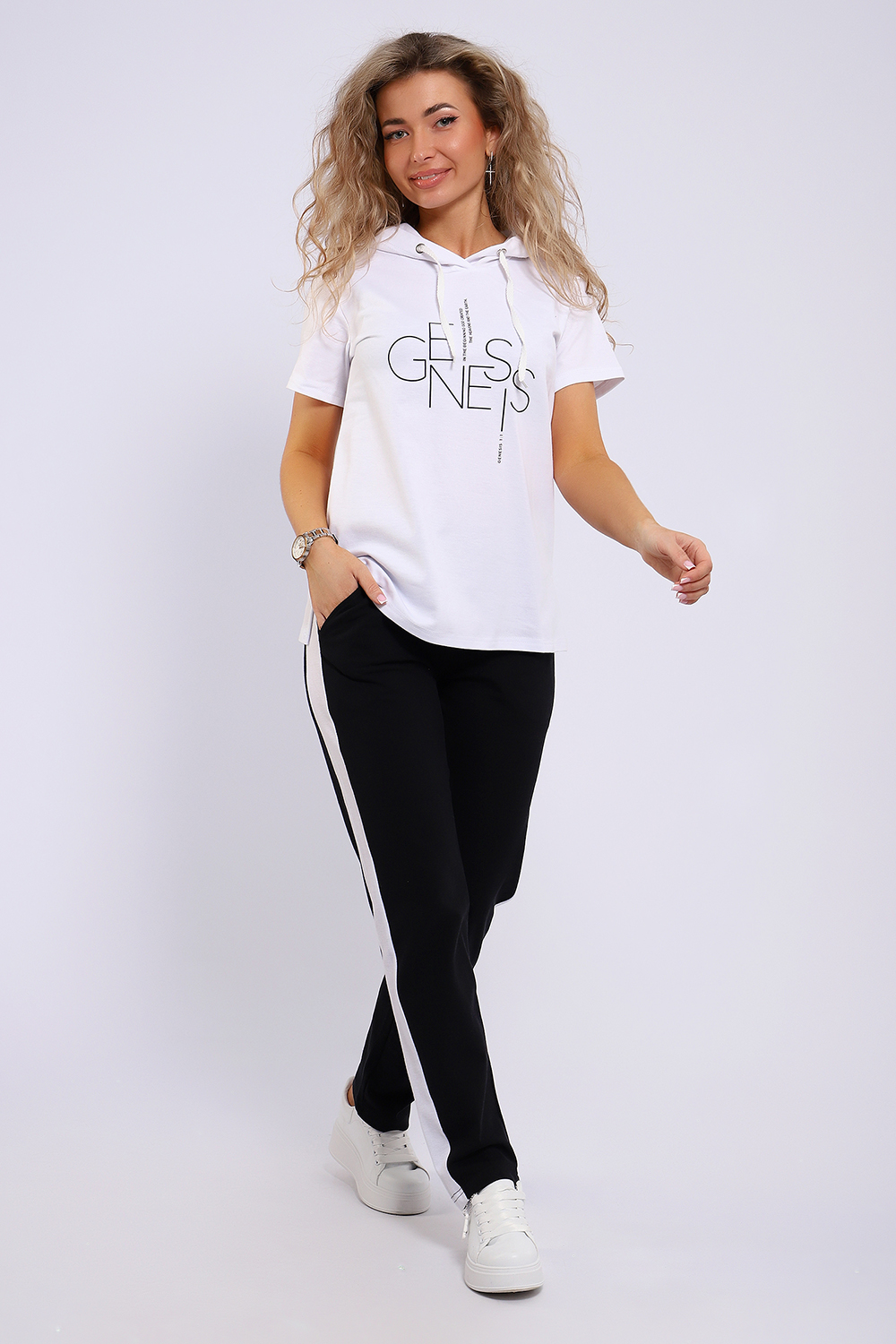 Легкий спортивный трикотажный костюм позволит вам выглядеть сногсшибательно в любой ситуации! Костюм прекрасно подойдет для занятий спортом, пробежек или прогулок! Кофта белого цвета, с надписью латинскими буквами в цвет брюк, имеет капюшон, способный защитить волосы от солнечных лучей, ветра или дождя. Объем капюшона регулирует изящный шнурок. На брюках имеются лампасы белого цвета, гармонирующие с цветом кофты.