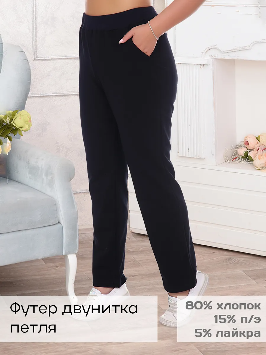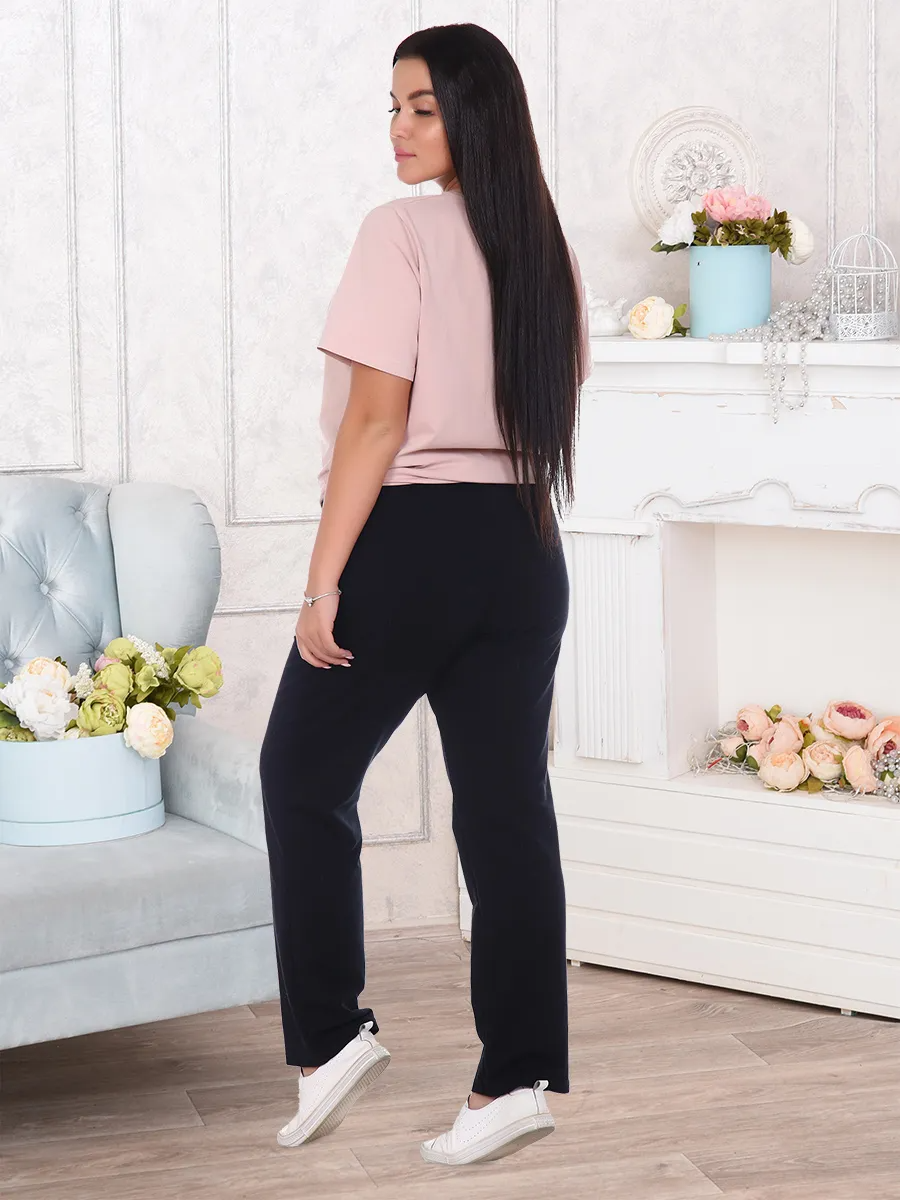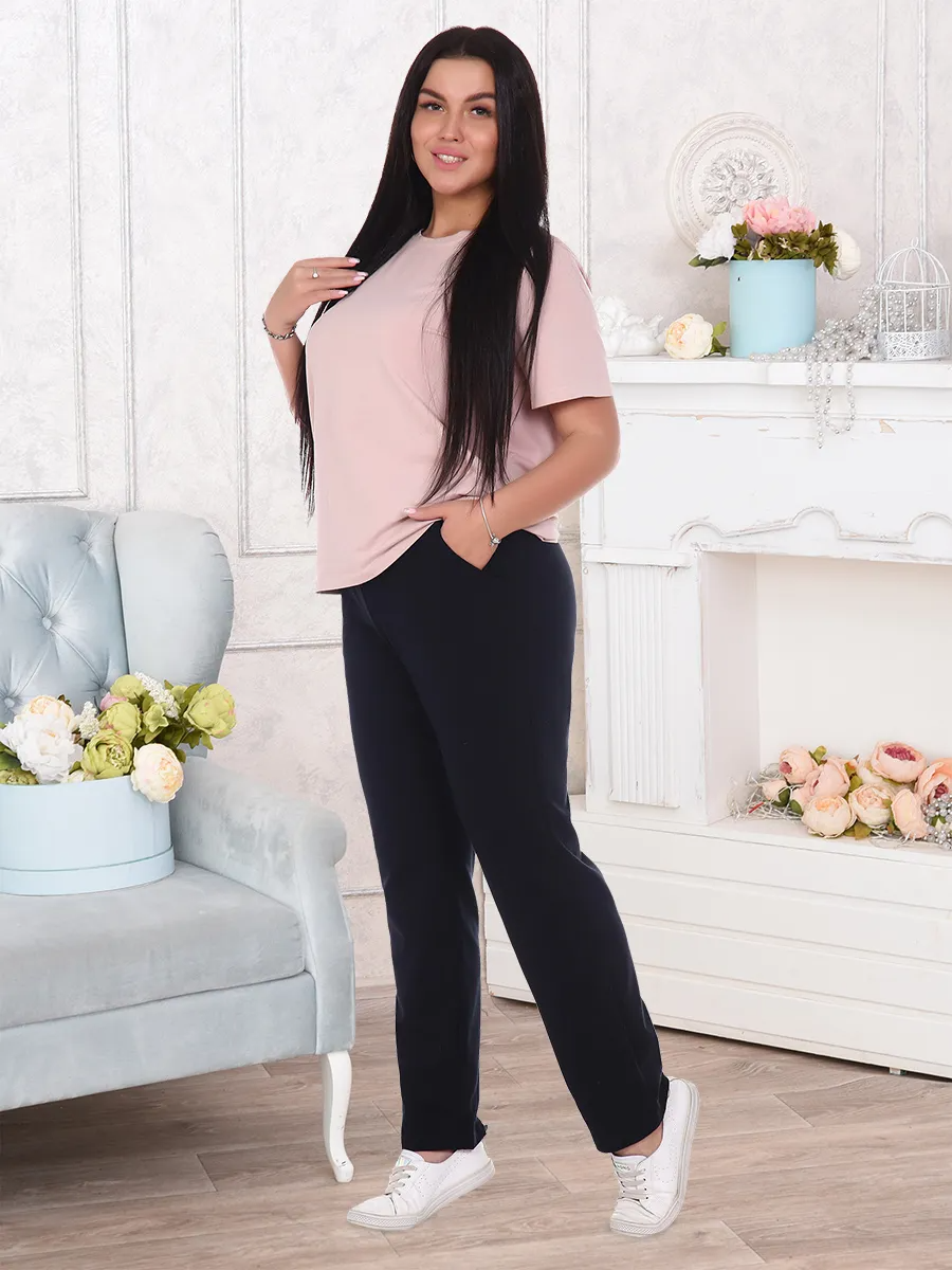 Брюки прямые на притачном поясе с резинкой с карманом в боковом шве.