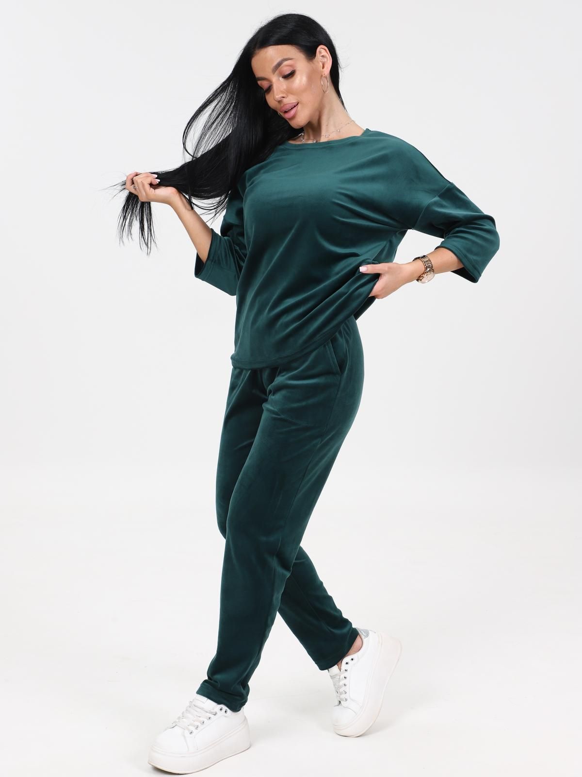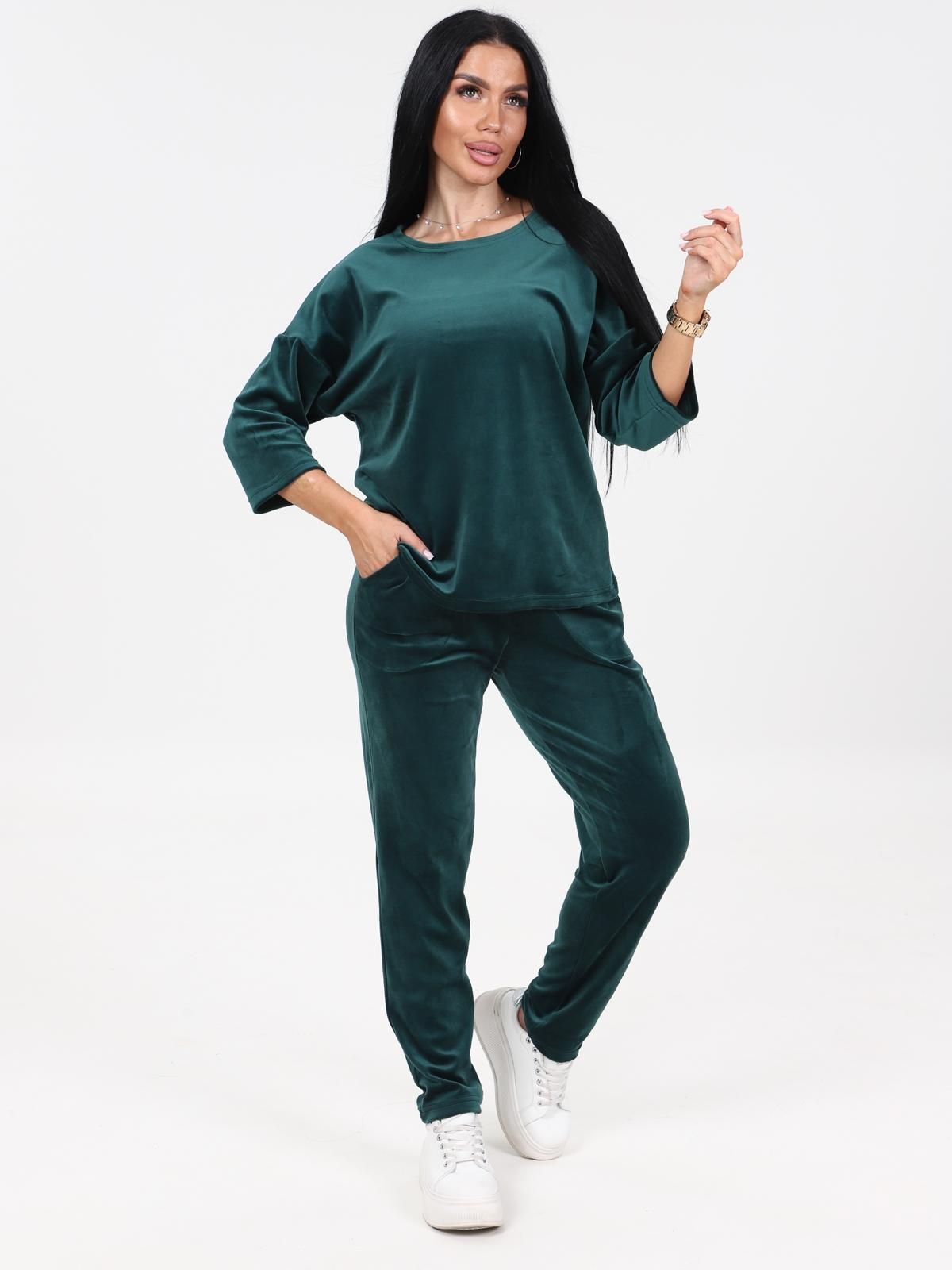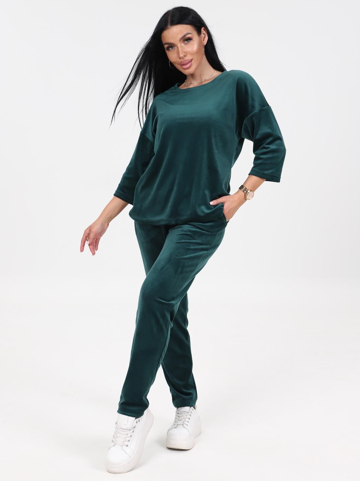 Женский трикотажный костюм состоит из кофты и брюк. Кофта прямого силуэта со спущенной линией плеча. Рукав 3/4. Брюки с карманами в боковых швах, верх на эластичной тесьме.