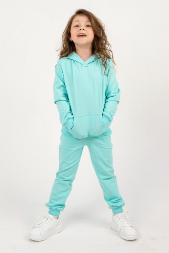 Костюм для девочек и мальчиков дошкольного и младшего школьного возраста. Костюм состоит из толстовки и брюк. Костюм из эластичного хлопкового однотонного футера. Толстовка с капюшоном, с длинным рукавом на манжете и поясе из основного полотна. На переде толстовки расположен карман-кенгуру. Брюки с боковыми карманами, на манжетах и поясе из основного полотна.