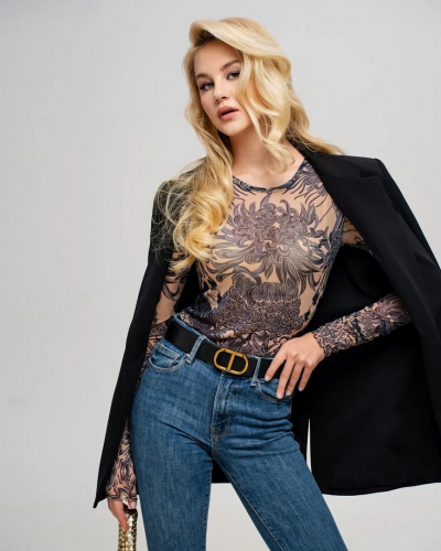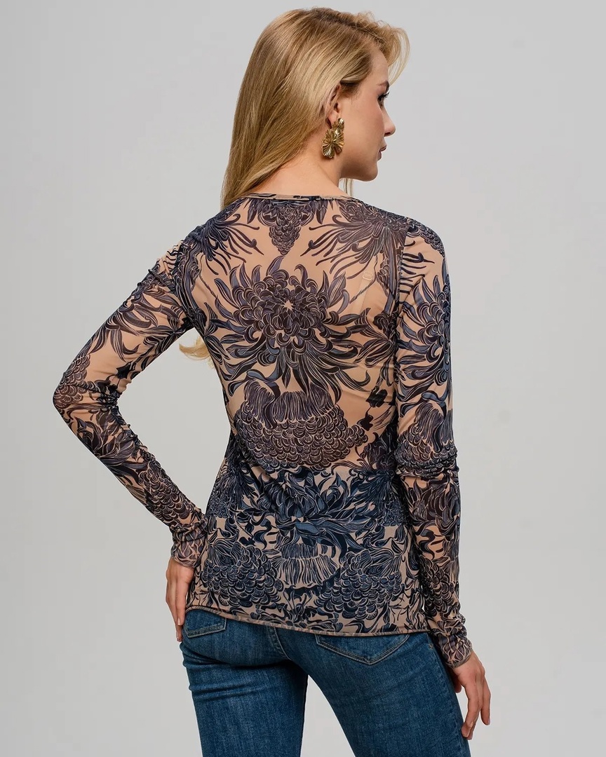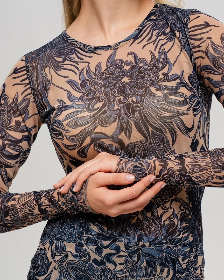 Лонгслив женский из сетки с принтом-тренд 2023-2024.  Его можно надевать под платье, жакет, кардиган, жилет или даже футболку.