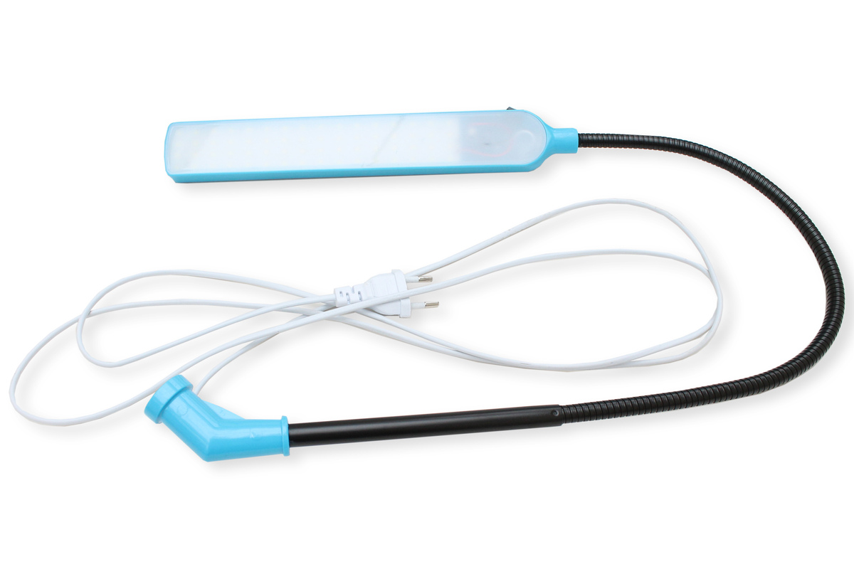 Лампа светодиодная с креплением к бобиностойке. Гибкая ножка позволяет регулировать угол наклона на 360. Подходит для любого типа швейных машин.