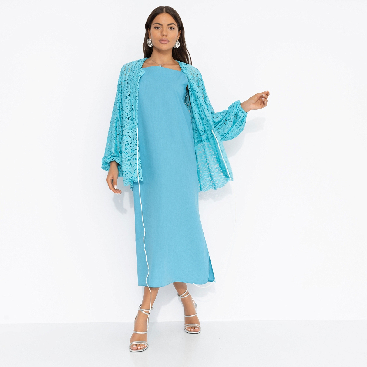 Комбинация от ЧАРУТТИ струится по фигуре, как шелковые волны у берегов Амальфи, а кардиган, наброшенный небрежно на плечи, будто сохранил тепло улочек Ниццы. Когда отпуск закончится, лазурный оттенок останется как счастливое напоминание... Достаточно надеть комплект снова, чтобы глаза загорелись тем самым блеском. Комплект состоит из кардигана прямого силуэта в длине миди и жакета из кружева. Хорошо смотрится на любом типе фигуры. Есть деликатный разрез. Кардиган на кулиске из кружевной ткани, слегка просвечивает. Свободные рукава обрамлены тонкой резинкой на запястье.