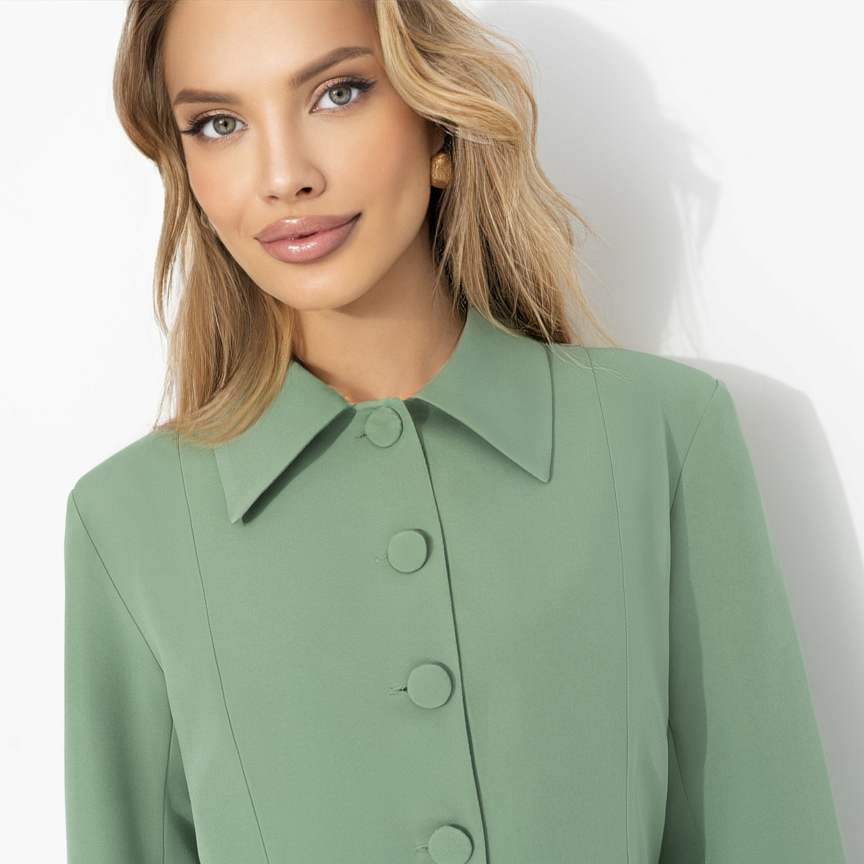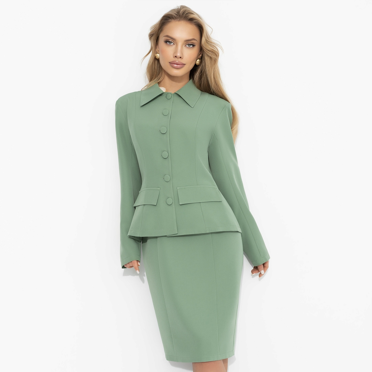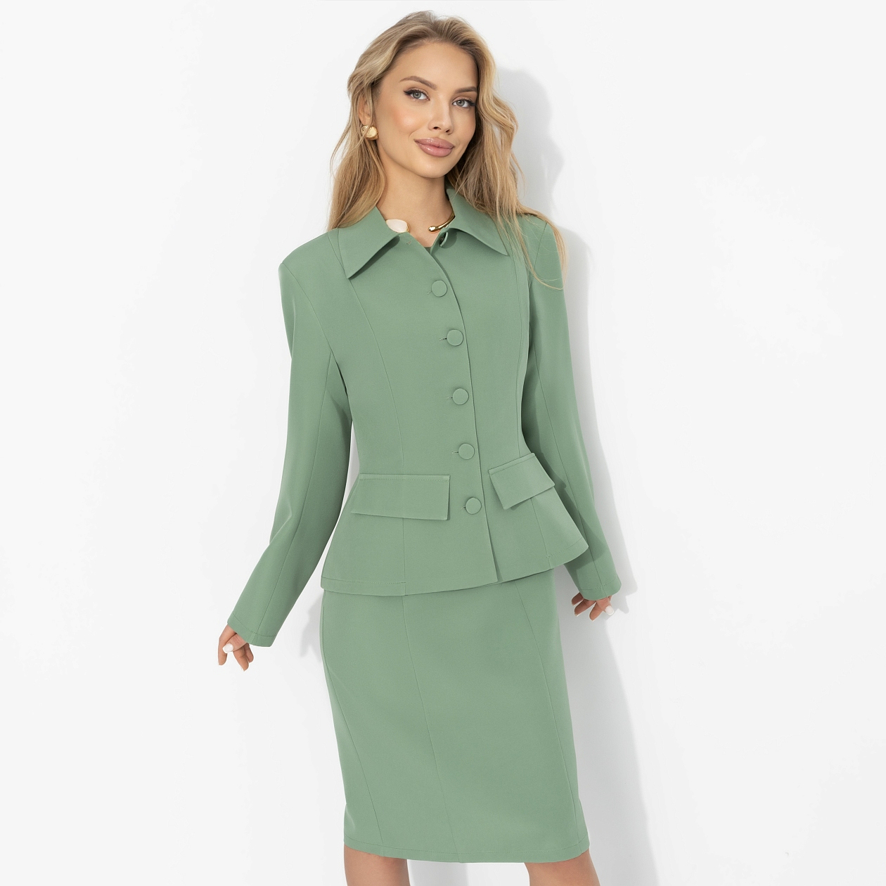 В этом образе от ЧАРУТТИ чувствуется намек на стиль Кэролин Бессетт-Кеннеди – безупречная простота, чистая линия, никакой показной роскоши. Мягкий шалфейный оттенок звучит интеллигентно и спокойно, приталенный жакет формирует талию, платье футляр собирает силуэт. Ткань с эластаном держит форму и строгость линий. Всё по правилам – но с тем самым тонким вкусом, который невозможно подделать.