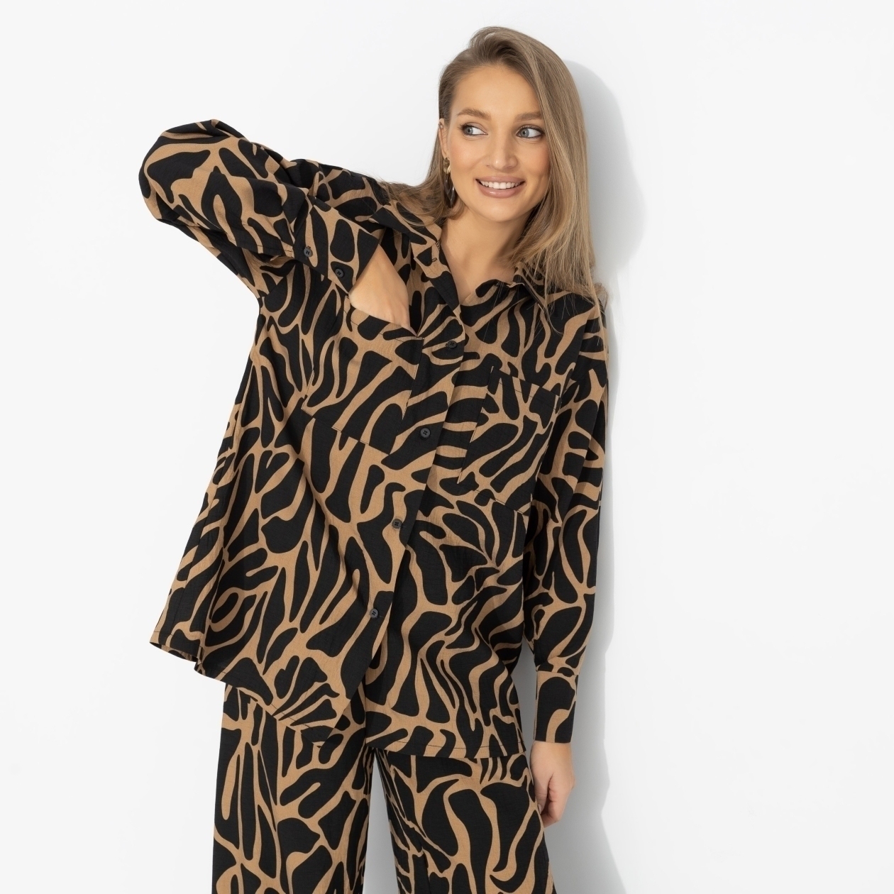 Встреча с подружками затянулась – смех, истории, кто-то уже зовёт продолжать вечер. Ты встаёшь, грациозно поправляешь волосы. Дерзкий принт двигается вместе с тобой, свободный силуэт струится. Девчонки шутят, что ты сегодня – настоящая женщина-кошка. Ты улыбаешься: так и было задумано.