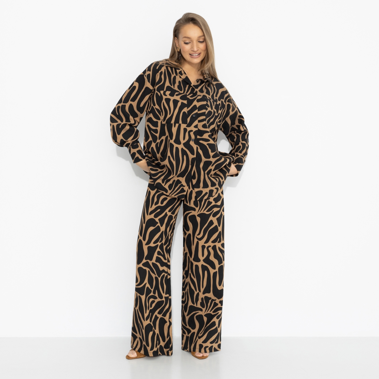Встреча с подружками затянулась – смех, истории, кто-то уже зовёт продолжать вечер. Ты встаёшь, грациозно поправляешь волосы. Дерзкий принт двигается вместе с тобой, свободный силуэт струится. Девчонки шутят, что ты сегодня – настоящая женщина-кошка. Ты улыбаешься: так и было задумано.