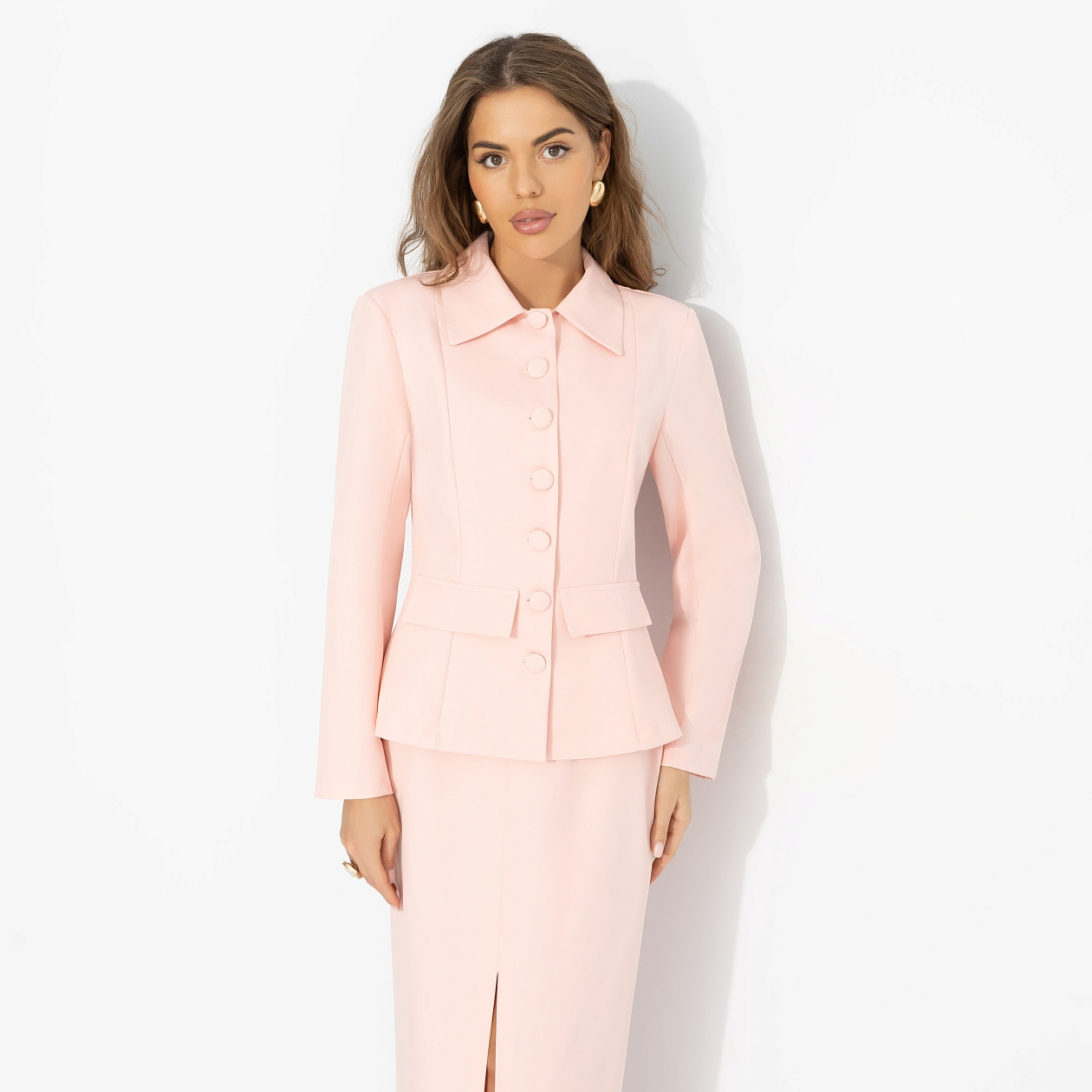 Сначала кажется – это про нежность. Потом становится ясно – про контроль. «Нежная власть» работает тонко: через посадку, линию плеч, через то, как вы держите себя в нём. Это не просто костюм. Это состояние, в котором вы не спешите – потому что решения уже приняты. Жакет прителенный на подплечниках.