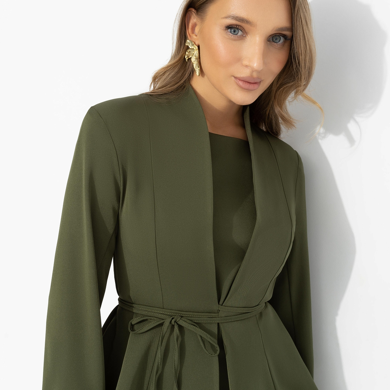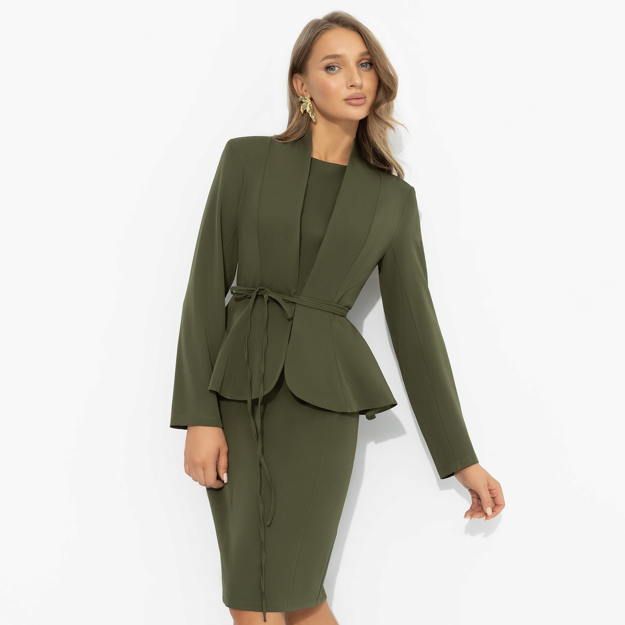 Закройте глаза и представьте: теплый вечер, прогулка, взгляд, который задерживается чуть дольше обычного. Этот сет создан именно для таких моментов. Оливковый цвет выглядит сдержанно, но действует безотказно – подчеркивает оттенок кожи, изгибы фигуры и ваши желания. Двойка 2 в 1 от ЧАРУТТИ: лаконичное платье-футляр и жакет с мягкой линией плеч и поясом. Ткань эластичная, гладкая, красиво облегает, не сковывает движений. Длина миди, идеальная посадка, можно носить вместе или раздельно.