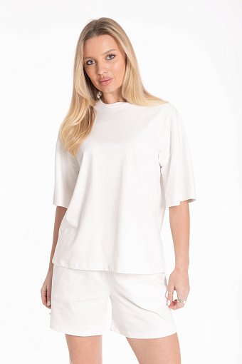 Костюм из однотонной плотной кулирки состоит из футболки и шорт. Футболка с рукавом комбинированного покроя длиной до локтя: спереди — реглан-погон, сзади — часть рукава цельнокроеная с кокеткой, часть втачная в пройму. Горловина обработана притачной планкой. Шорты с боковыми карманами и цельнокроеным поясом, дополненным шнуром, продетым через петли. Удобный и практичный комплект для повседневной носки и отдыха.