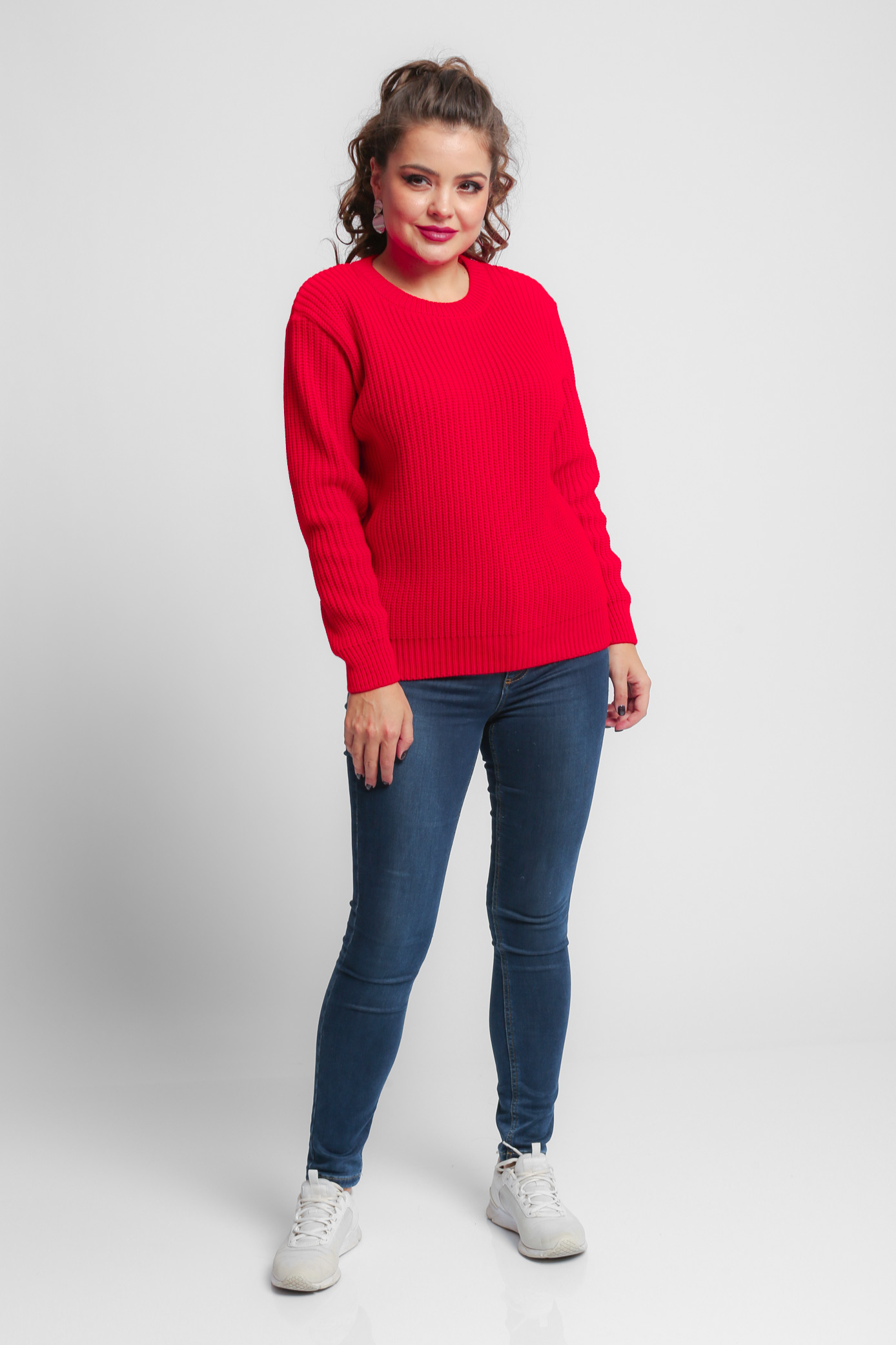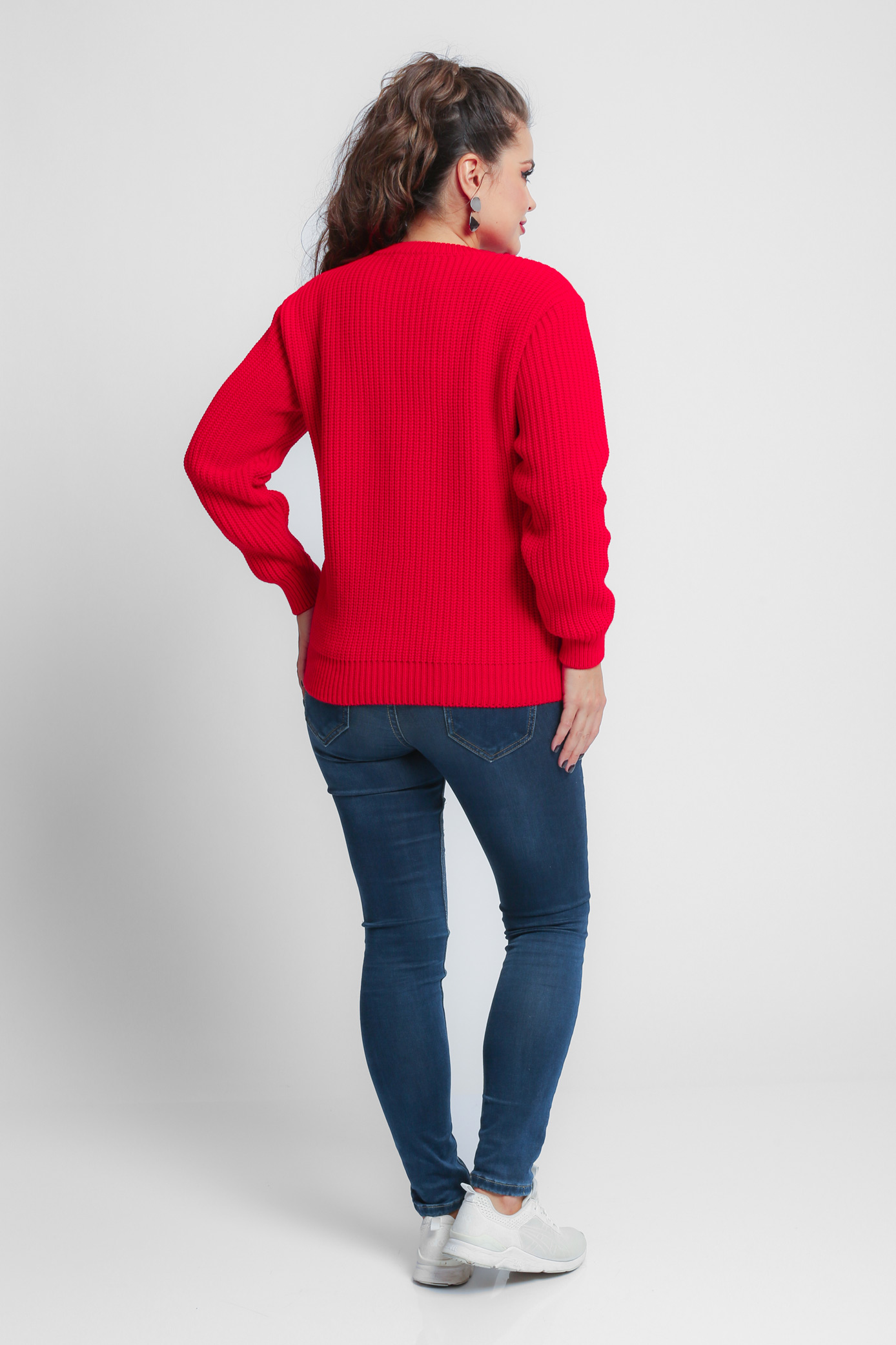 Джемпер свободного силуэта с круглой горловиной. Плечо спущенное, рукава втачные.  Изделие выполнено крупными "жемчужными" петлями. Горловина, низ изделия и низ рукавов выполнены эластичным переплетением. красный