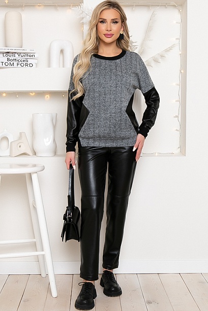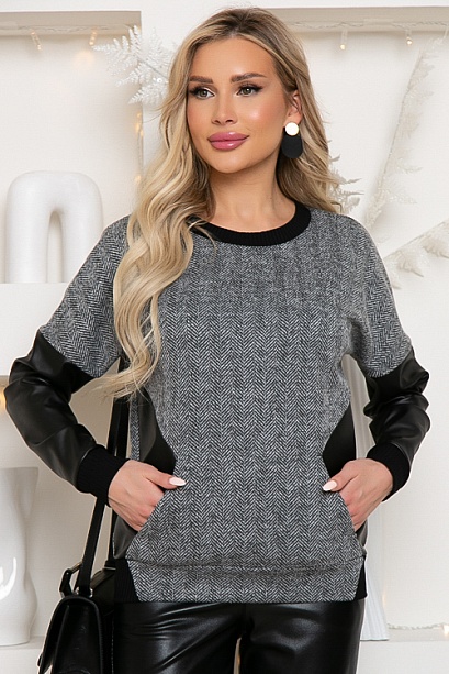 Комбинированный джемпер из трикотажного полотна в елочку и экокожи.