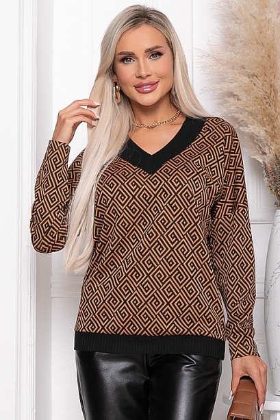 Джемпер из жаккардового трикотажного полотна свободного силуэта с отделкой трикотажной рибаной по  V-горловине.