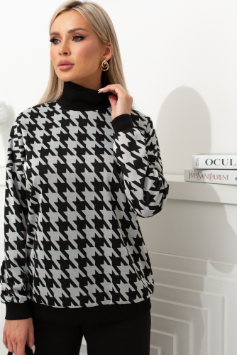 Стильный джемпер из трикотажного полотна свободного силуэта. Воротник стойка. Плечо спущенное, рукав оканчивается притачной манжетой. Низ ровный, оканчивается притачной манжетой.