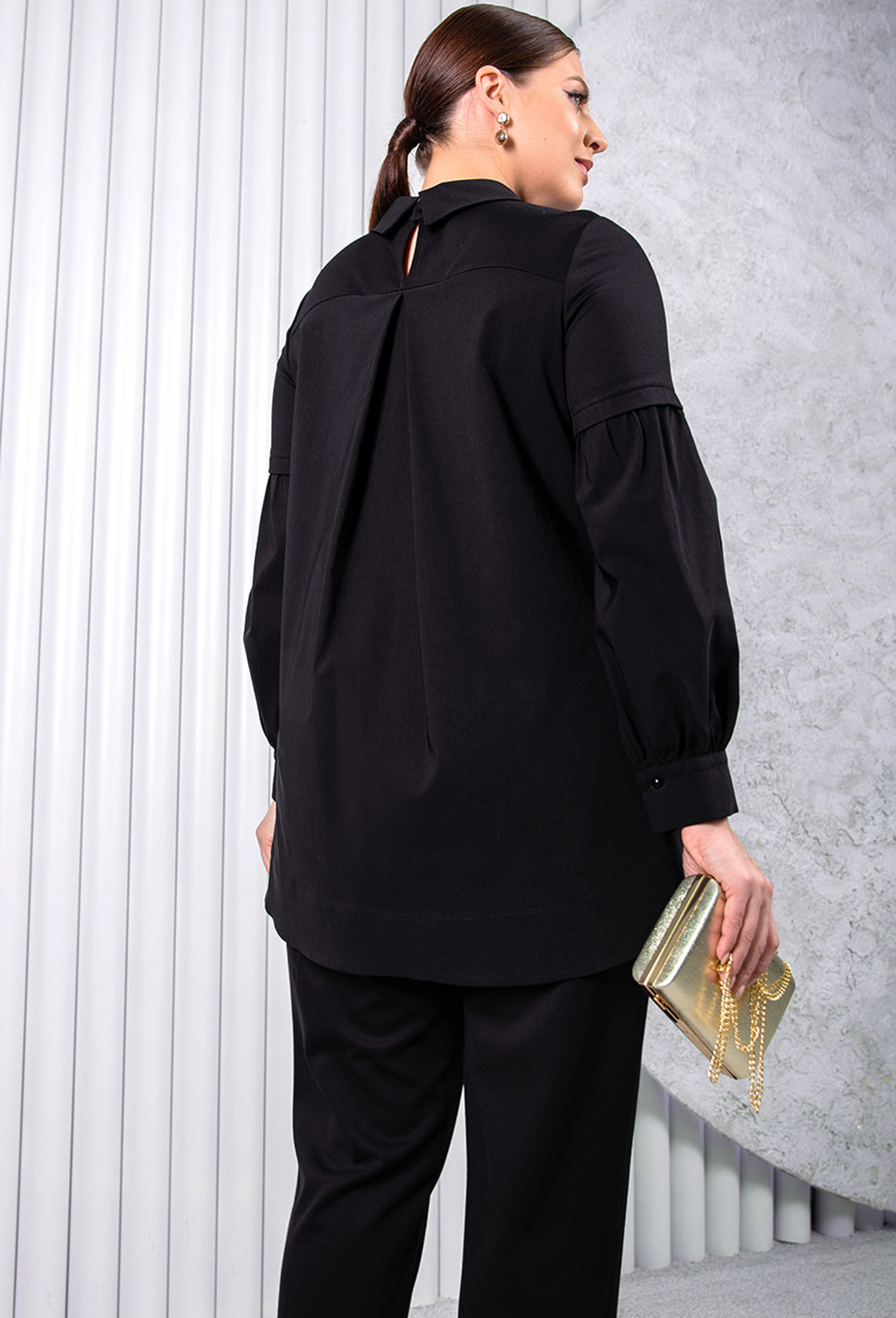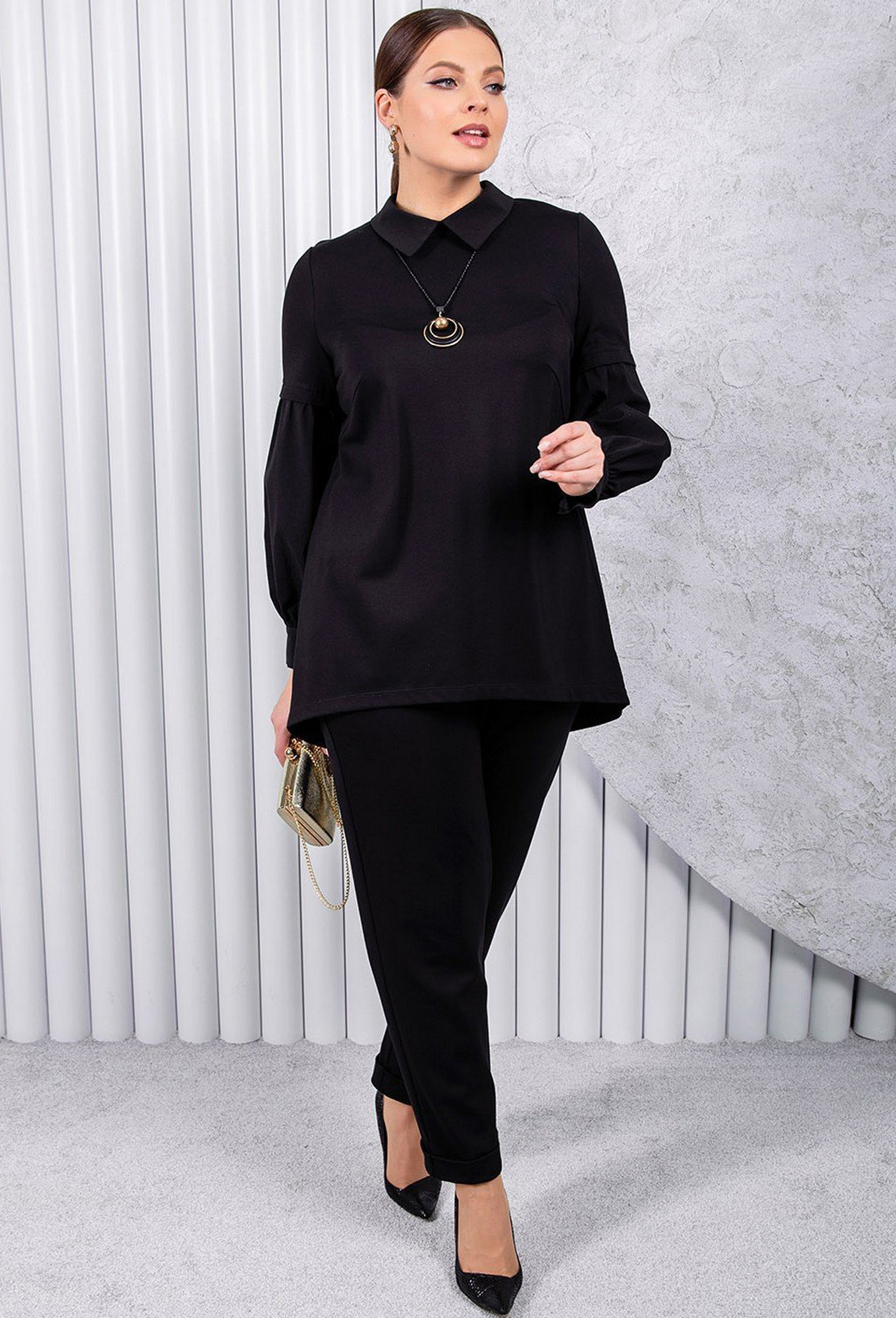 Модель: АСВ 2451 чёрный Рост: 164..показать см (девушка на фото ростом 170см) Сезон: Круглогодичный Тип ткани: Вискоза 60% , нейлон 34% , спандекс 6%Свитшот прямого силуэта с длинным рукавом с притачными манжетами. Горловина округлая с рубашечным воротником._x000D_