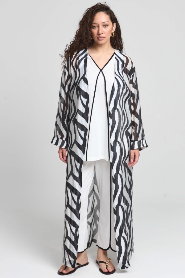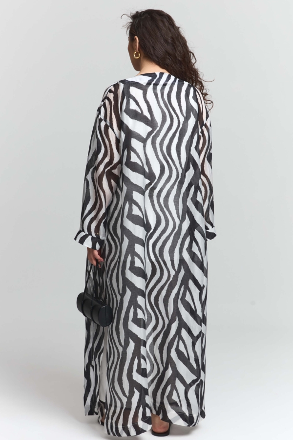 Накидка-кимоно макси для создания летних непринужденных образов. Спущенное плечо, карманы и длинные разрезы в боковых швах, широкие рукава.