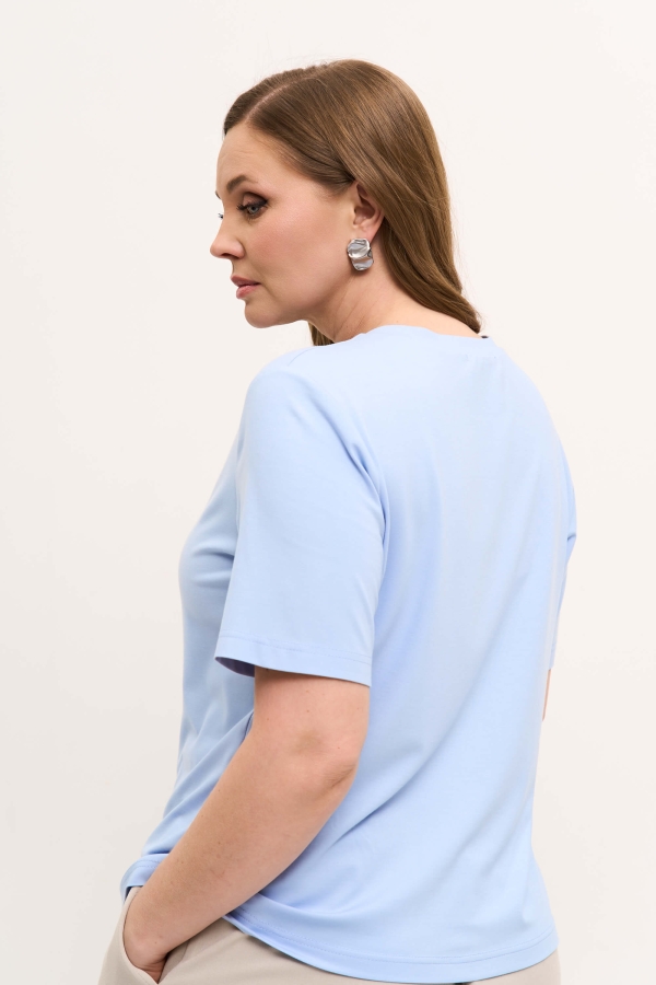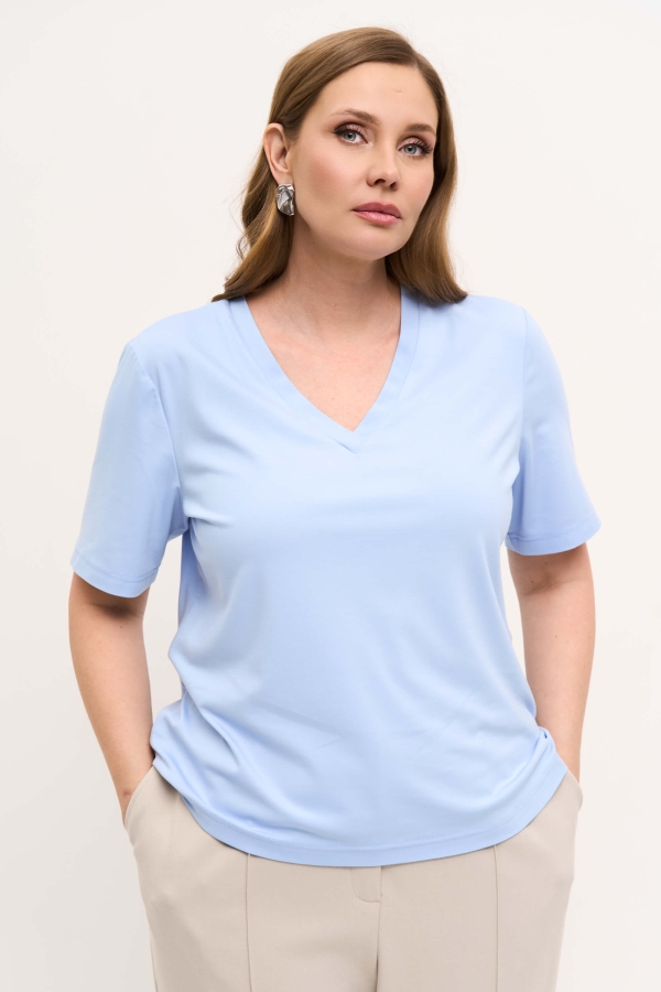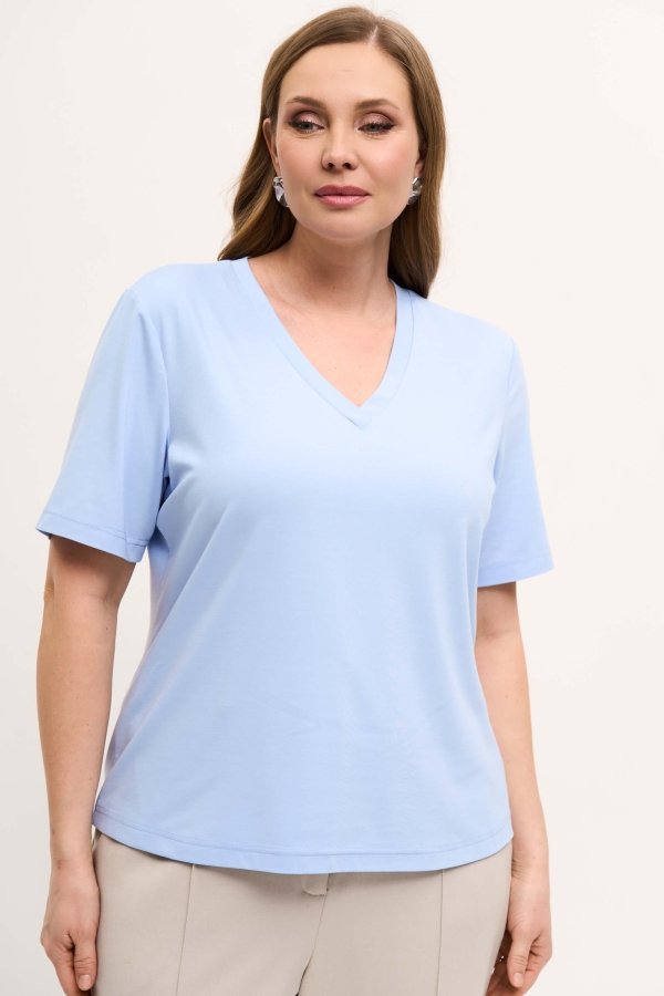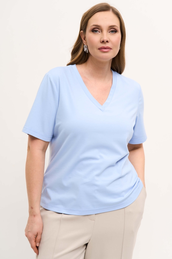Джемпер из вискозного трикотажа. Модель свободного силуэта. По переду V-вырез. Рукав втачной, короткий.