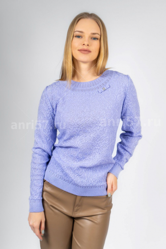 Джемпер из тонкого вязаного полотна с фактурным узором. Горловина округлой формы с обтачкой в виде "кокетки", декорированной тесьмой и украшением из металла. Рукав втачной, прямой. Низ изделия и низ рукава на "резинке".