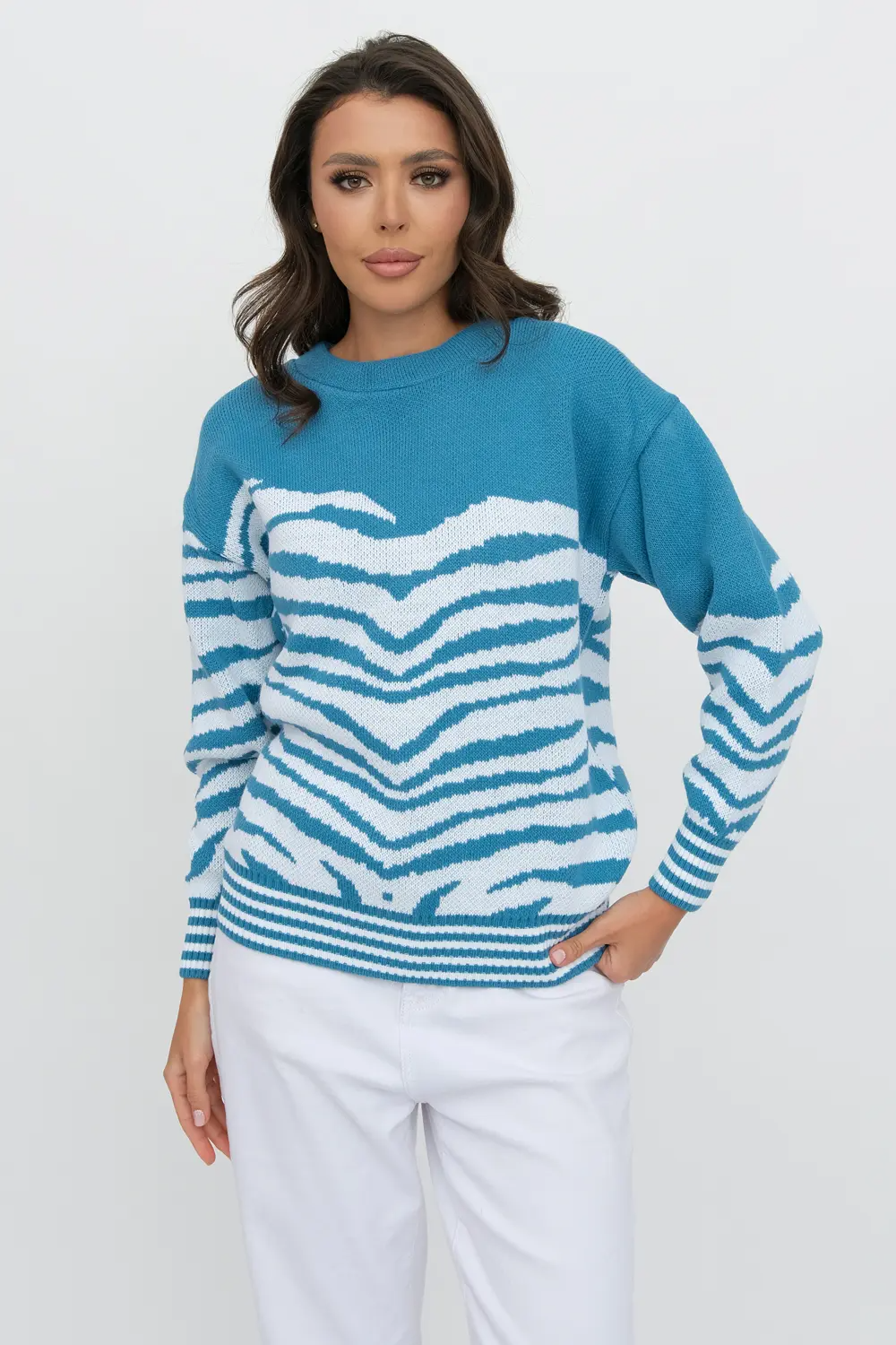 Современный женский джемпер свободного силуэта с круглой горловиной. Спущенное плечо,рукав полной длины. Джемпер выполнен жаккардовым переплетением с абстрактным рисунком. Низ изделия и низ рукавов с эластичным переплетением. морской